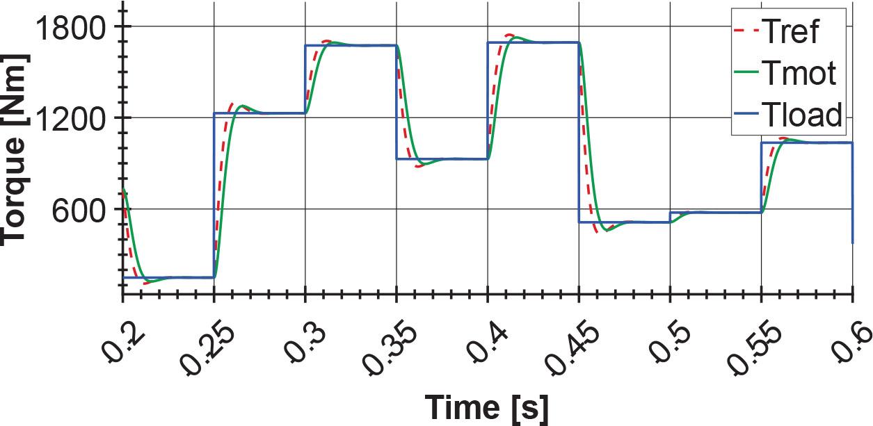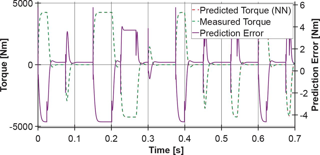 Validation of the NN model of the torque control loop was performed using a separate test dataset that was not used during model training. (See Table 5). The verification was carried out on multiple dynamic transitions of both the torque reference and the load torque, to capture both steady-state regions and regions with rapid changes. The predicted torque was then compared with the actual measured motor torque.