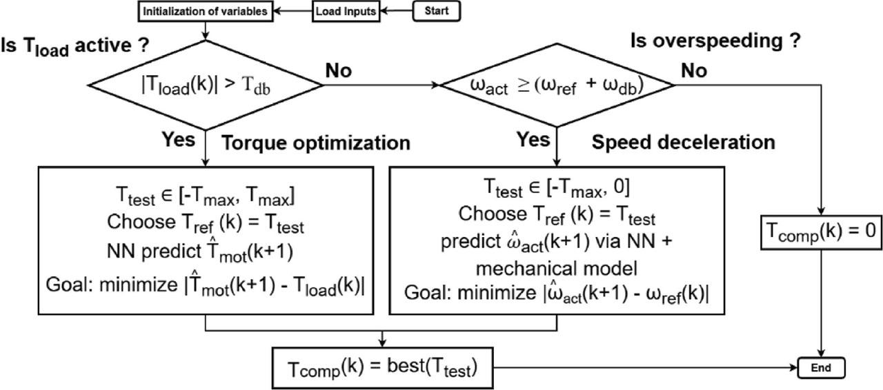 The computation of the ideal torque reference value represents a key step of the proposed method, in which the classical speed control loop with a PI controller is augmented by predictive NN–based torque compensation. The objective of the algorithm is to determine, at each sampling step, a torque reference value that minimises the control error in the subsequent step. The overall decision-making process is illustrated in Figure 9.