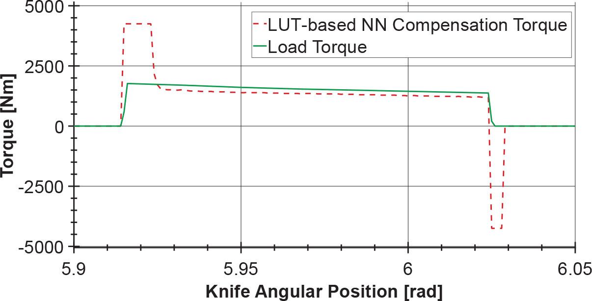A significant advantage of the NN–based approach is the possibility of offline optimisation of the compensation signal and its straightforward implementation in an industrial control system in the form of a LUT. Moreover, the influence of knife wear on the optimal compensation profile can be incorporated into the model, allowing changes identified in the real system to be directly reflected in the control strategy.