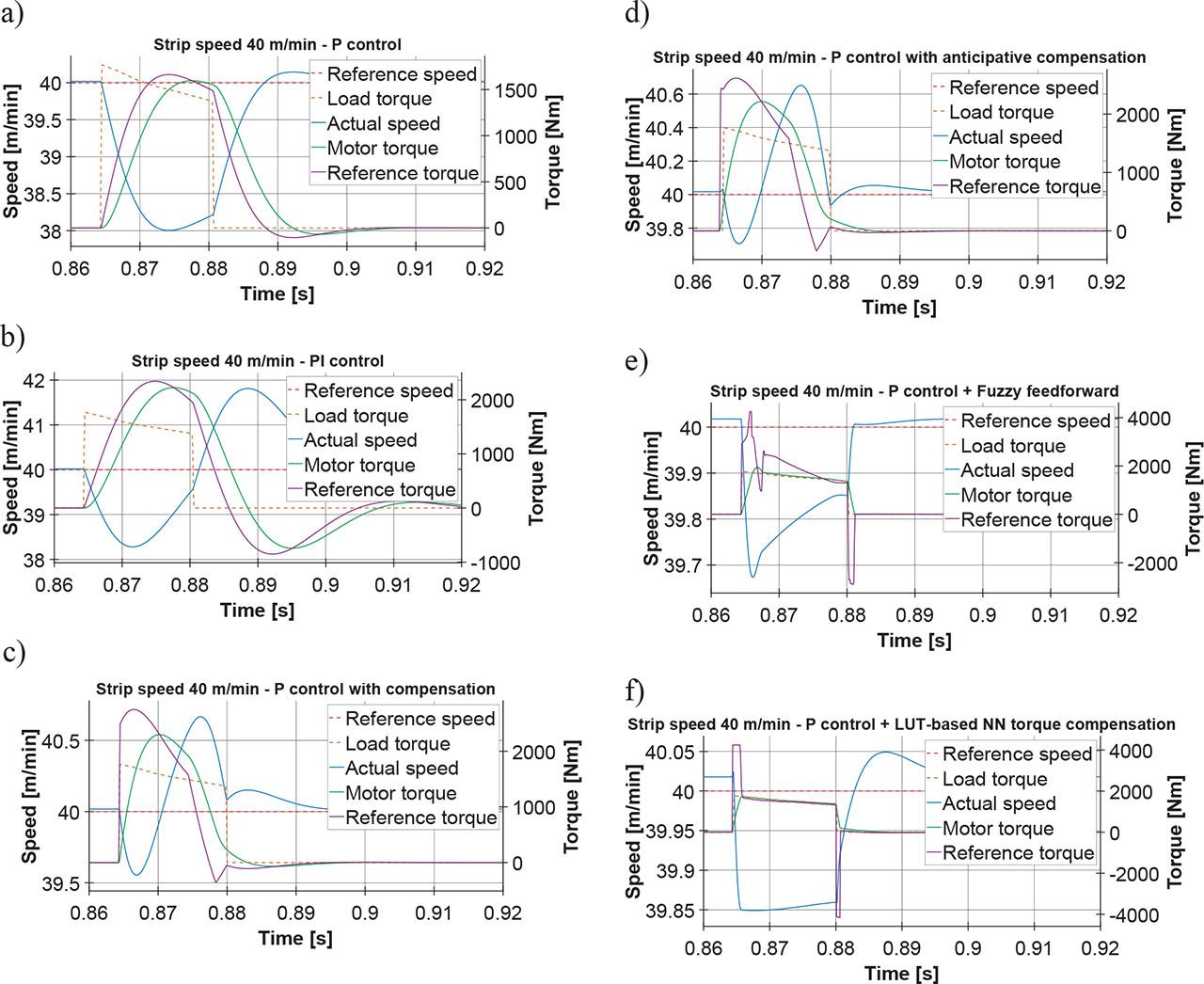 Figures 12a–f illustrate the speed and torque responses for the individual tested control and compensation approaches under identical cutting conditions. Figure 12a shows the reference response obtained using a basic P controller, while Figure 12b presents control using a PI controller. In both cases, shear torque compensation is disabled. Figure 12c depicts P control supplemented with a separate compensation signal, and Figure 12d shows P control extended by anticipatory compensation applied before the expected shear load. The time advance of the compensation relative to the cutting instant was determined using a trial-and-error method and optimised for a strip speed of 40 m/min. Figure 12e presents P control augmented with a fuzzy controller, and finally Figure 12f illustrates the control structure in which the compensating torque is generated by a NN model stored in the form of a LUT.
