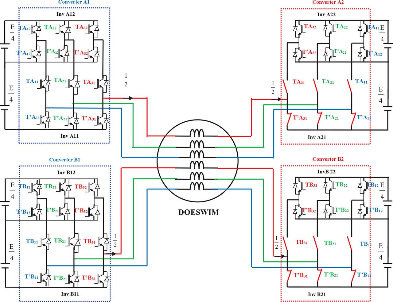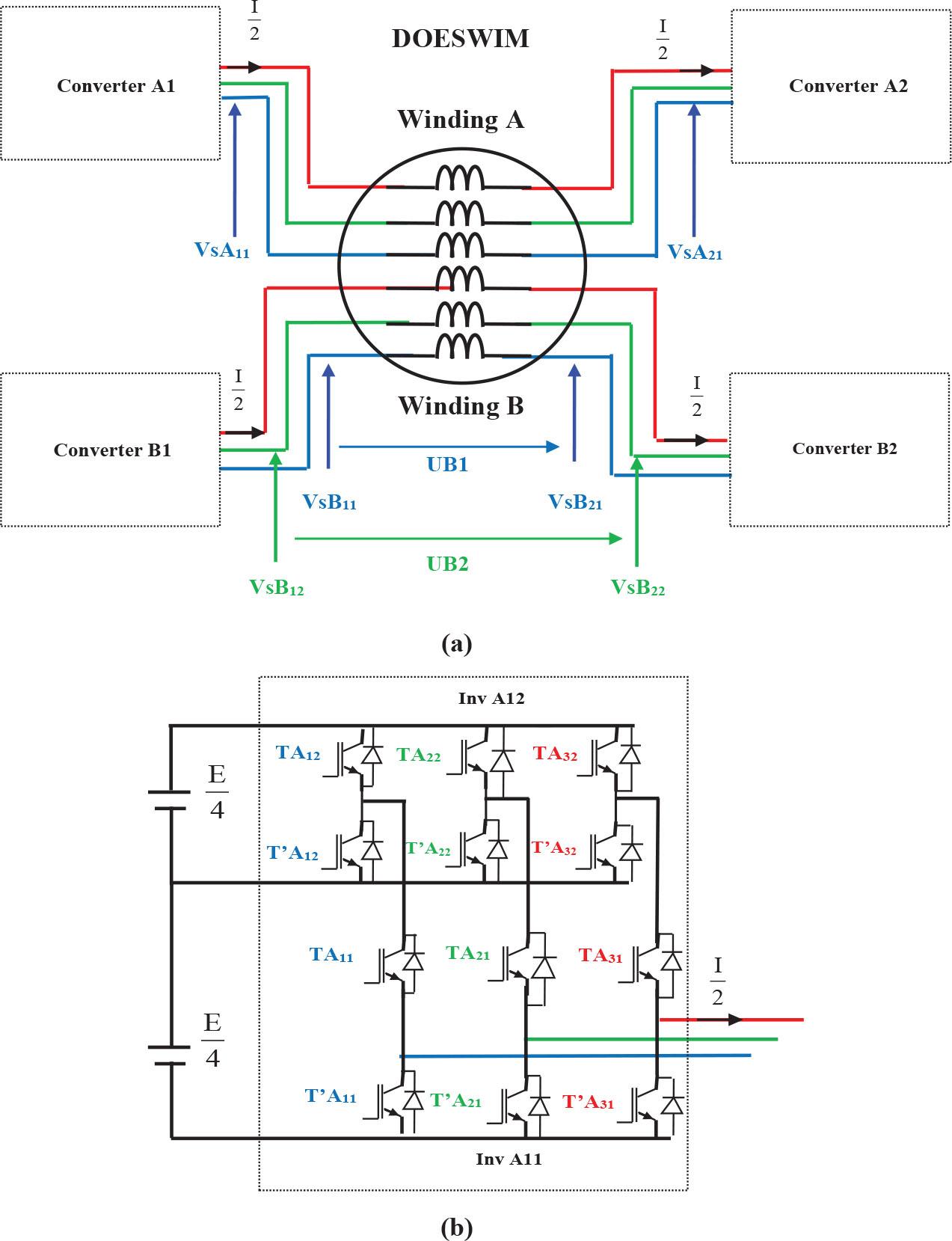 Figure 1a presents the configuration of the DOESWIM, which is fed by four separate converters. The converter topology, illustrated in Figure 1b, comprises two cascaded two-level inverters. A V/f control scheme is implemented to manage the fundamental operation.