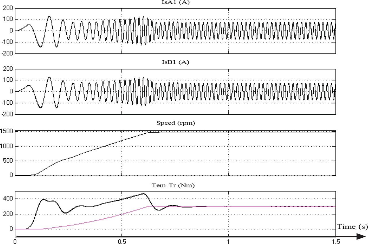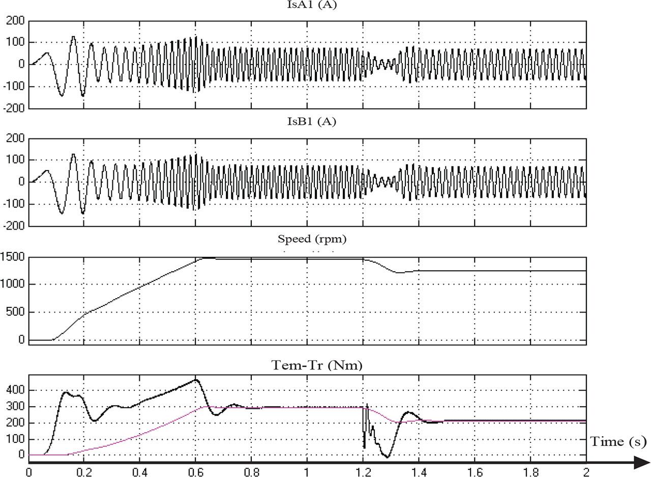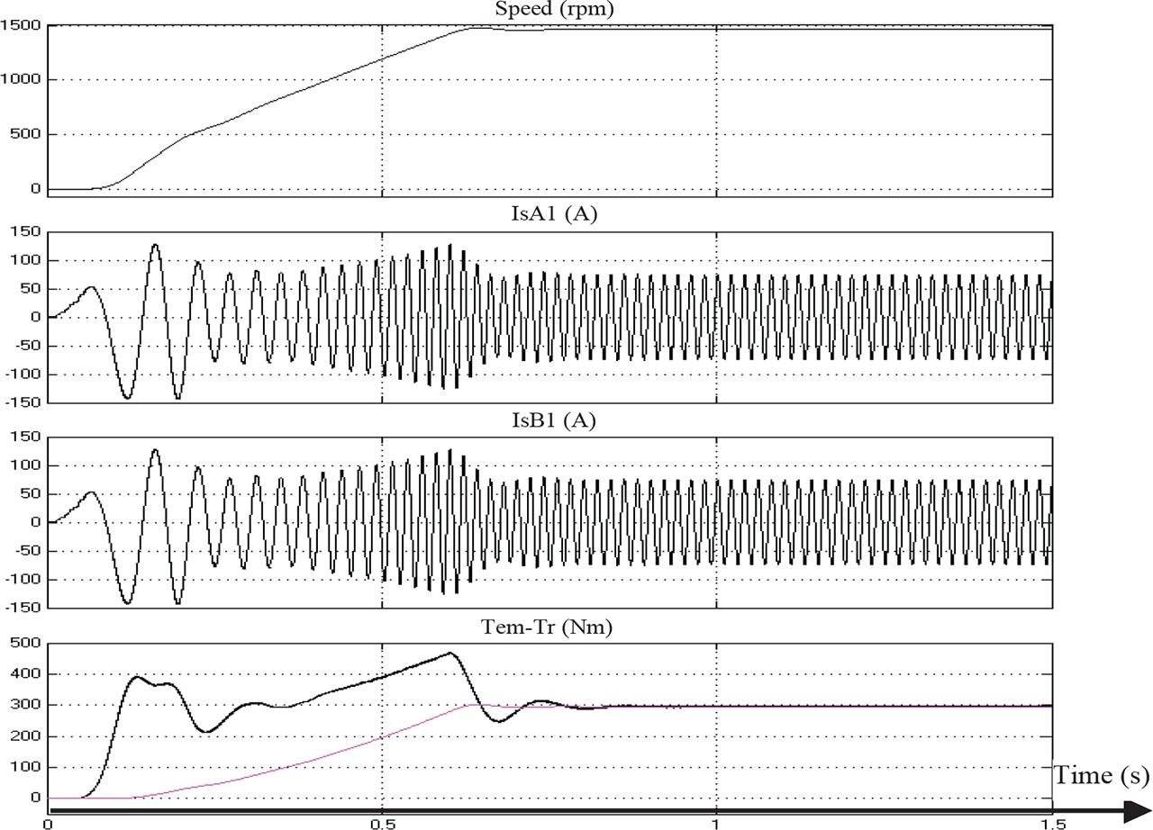 The variation of the speed, the two-stator currents, and the torques for the two windings A and B of the machine are shown in Figure 3. The operational cycle proceeds as follows: at t = 0.6 s, the system initiates a starting sequence. The machine then runs under no-load conditions from t = 0.6 s to t = 1 s. Subsequently, a load torque (Tr = 300 Nm) is introduced at t = 1 s for the remainder of the cycle.