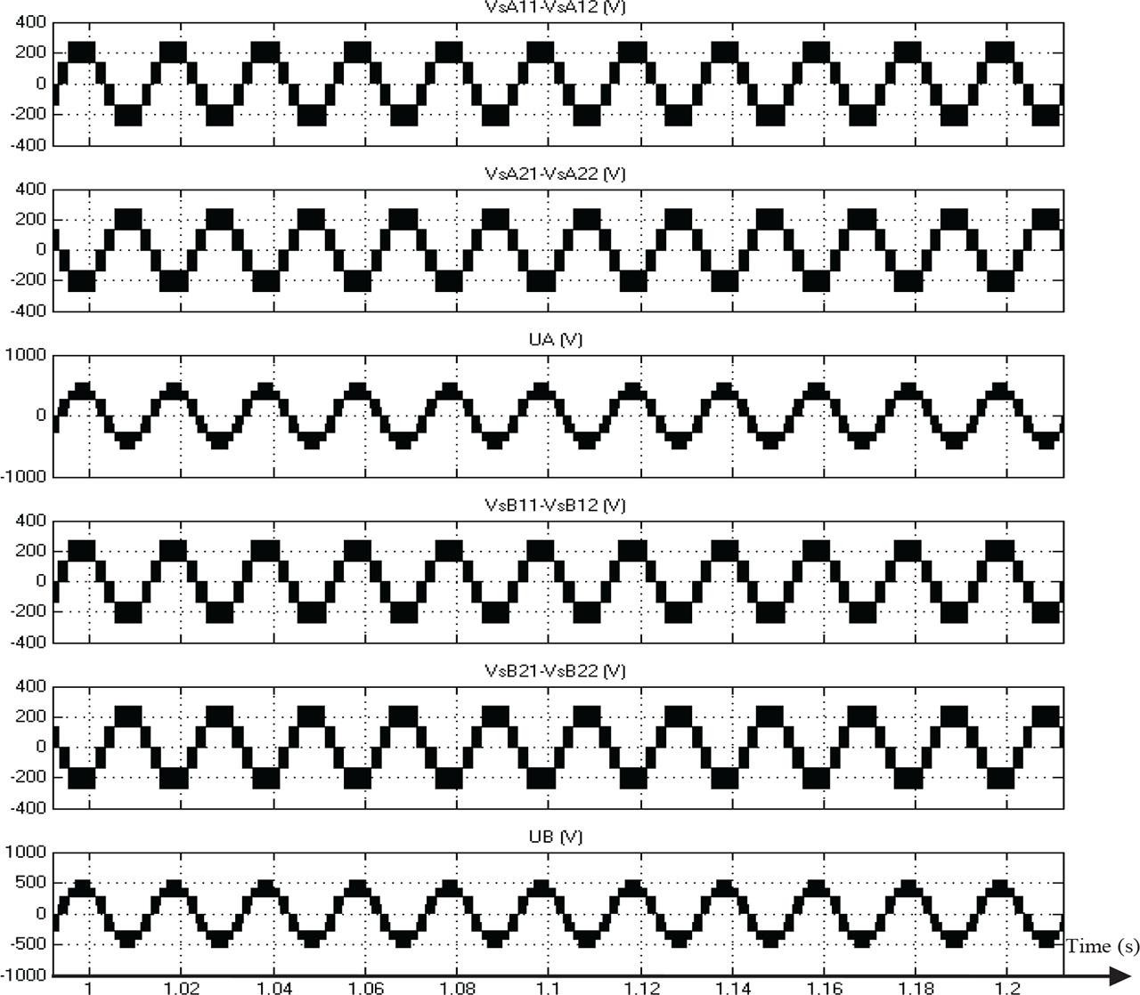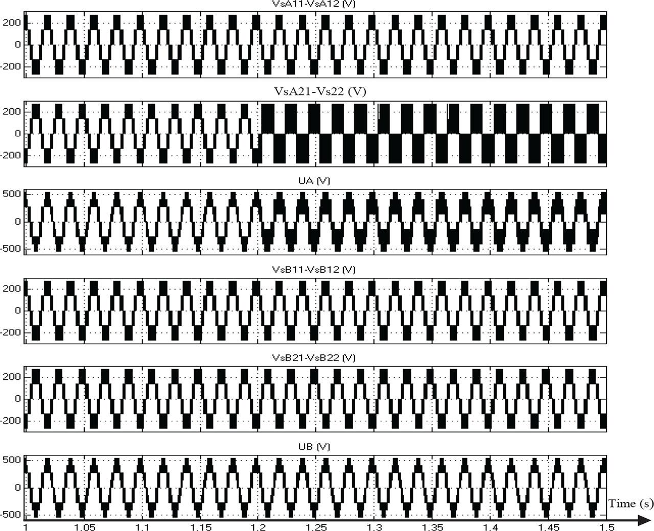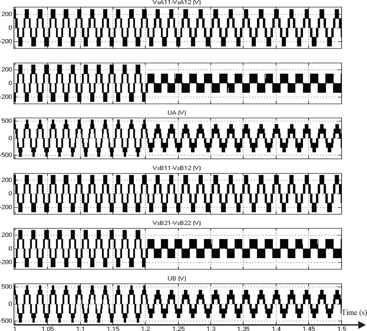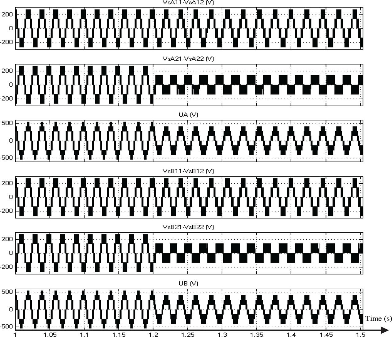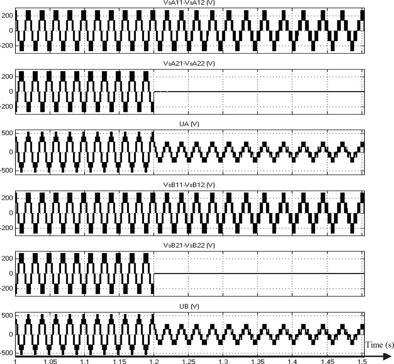 Figure 12 shows the same simulation results than the second configuration of the pole voltage of the four converters and phase-to-phase machine voltage before and after the failure of inverter A21 and inverter B21.