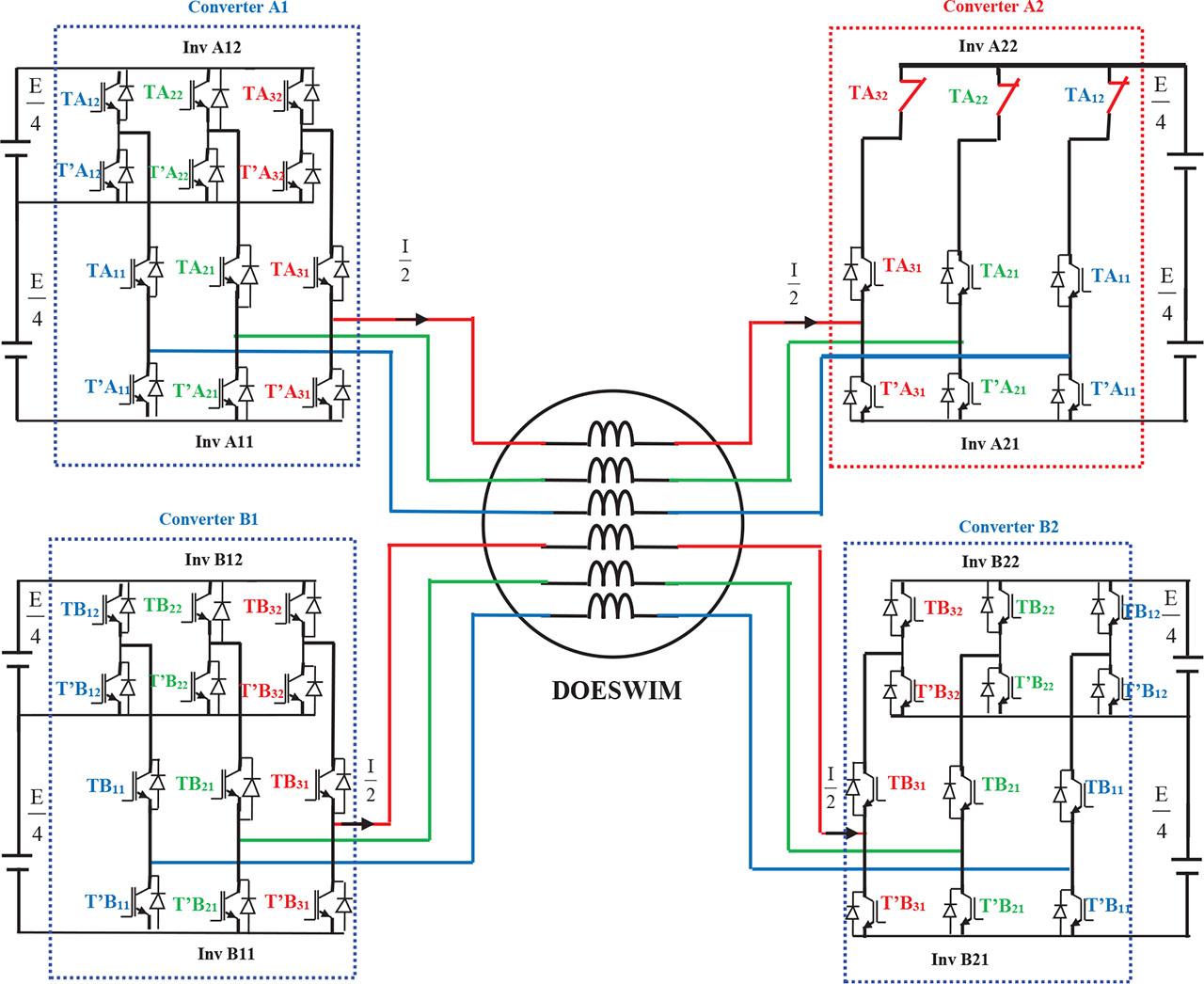 The first configuration corresponds to an open-circuit fault on the power switches T’A12, T’A22, or T’A32 of inverter A22. Consequently, the control sets switches T’A12, T’A22, and T’A32 to state 0 and switches TA12, TA22, and TA32 to state 1, as represented in Figure 5. Given that the DC bus voltage at point A2 equals E/2, the machine is capable of operation at its nominal speed. Because inverter A21 is sized for a power rating of P/4, no specific operating conditions are necessary.
