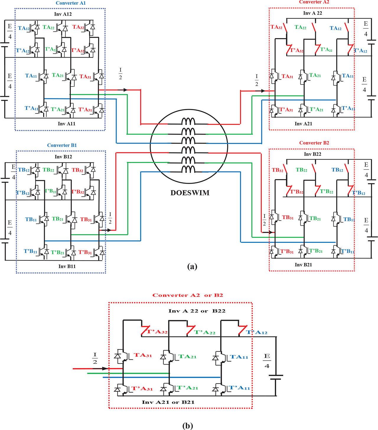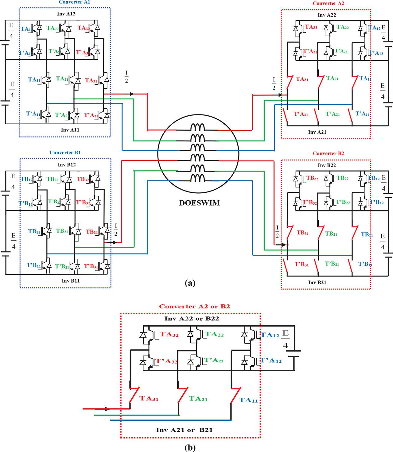 (a) Feeding of the DOESWIM by four converters for the third configuration. (b) Reconfiguration of the converters A2 and B2 for the third configuration.