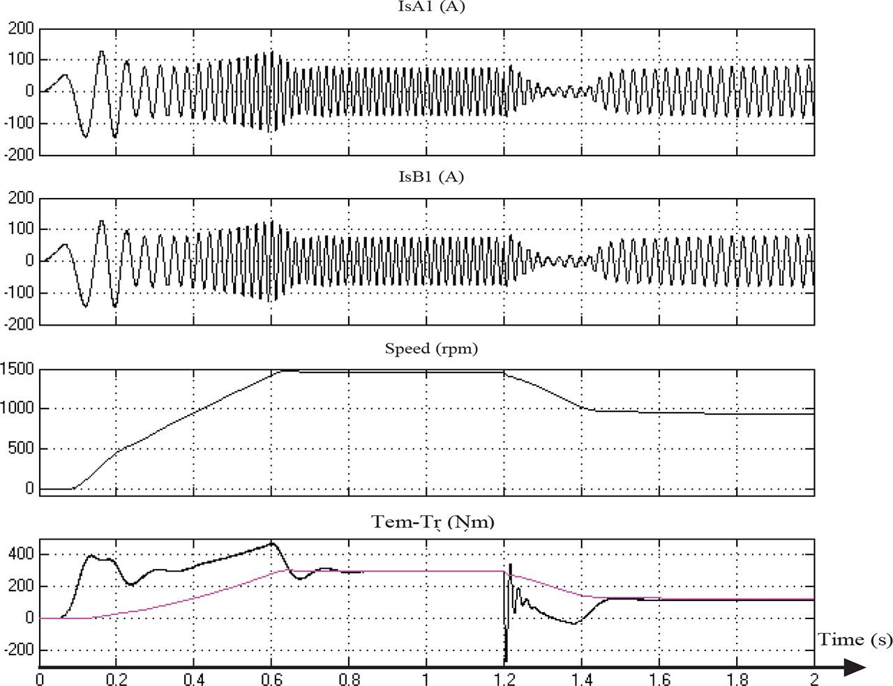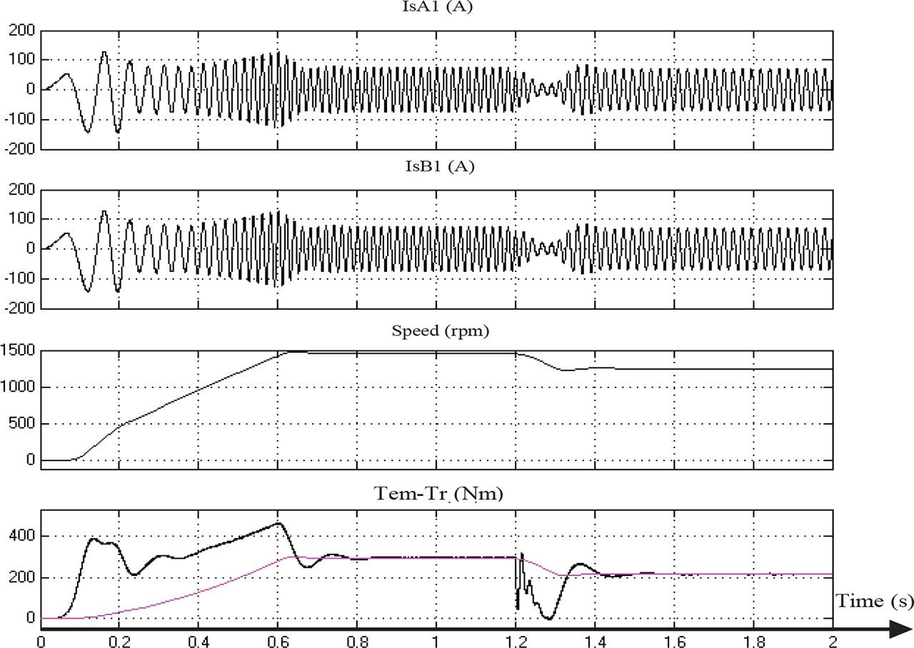 Figure 17 shows the different variations of the two-stator currents, speed, and the torques with reduced speed to 70% of nominal value for a load torque Tr = kω2.