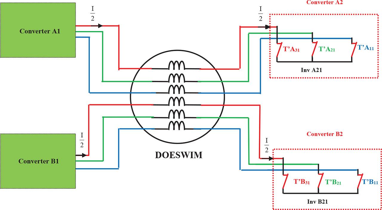 (a) Feeding of the DOESWIM by four converters for the second configuration. (b) Reconfiguration of the converters A2 and B2 for the second configuration.