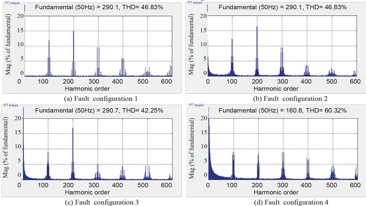 FFT spectra of the output voltage for the different fault configurations.