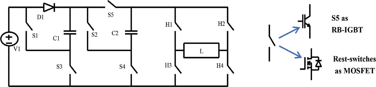 Schematic diagram details of proposed CSMLI. CSMLI, switched capacitor multilevel inverter; RB-IGBT, reverse block IGBT.