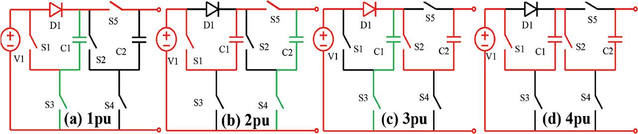 Mode diagram for all active voltage levels (red is conduction path, green is charging path and black is non-conducting). (a) Mode diagram during 1 pu. (b) Mode diagram during 2 pu. (c) Mode diagram during 3 pu (d) Mode diagram during 4 pu.
