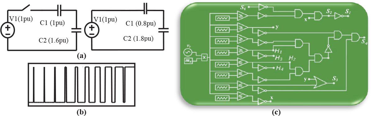 (a) An example of instant voltage status of both capacitors during normal operation. (b) Typical SPWM output during 1 pu-voltage level, where upper band is 1 pu and lower band is 0 pu. (c) Logic circuitry for generating gate pulse for all switches.