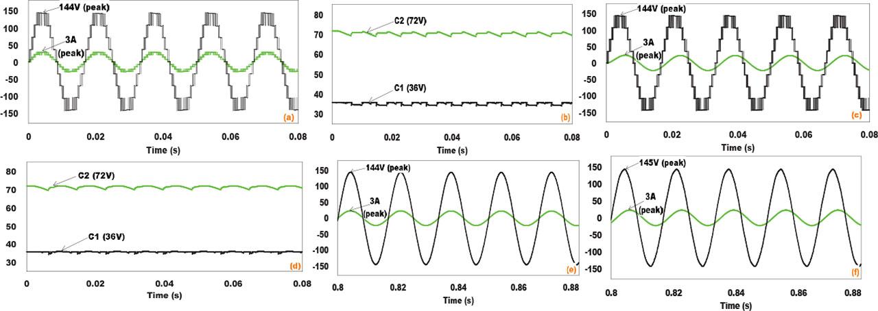 Steady-state output results (a) Output voltage and current waveform for a resistive load of 48 Ω (b) Voltage profile of capacitors C1 and C2 with load of 50 Ω (c) Steady-state output voltage and current waveform for a resistive load of 48 ∠ 45°Ω (d) Steady-state voltage profile of capacitors C1 and C2 with load of 48∠ 45°Ω (e) Filtered output voltage and current profile for resistive load of 48∠ 45° Ω (f) Filtered output voltage and current profile for inductive load of 48 ∠ 45°Ω.