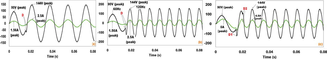 Figure 10 investigates the transient analysis of the circuit and shows some figures highlighting the behaviour of the circuit during transient state. As can be seen, Figure 10a indicates output performance of the proposed topology under disturbed condition. Point ‘D’ indicates point of disturbance. Initially, an R–L load of 17 ∠ 30°Ω. is applied with a 60-Hz supply frequency and 0.6 MI. Then at point D, a sudden change in frequency, load impedance, and MI are introduced. The frequency is changed to 120 Hz, MI changed to 0.95, and load is changed from R–L type to pure resistive load of 29 Ω. It can be observed that the pf factor changes in accordance with the value of load current. The voltage wave immediately regains its full capacity with change in MI to 0.95. Overall, the waveform changes appear to settle with new conditions within one full cycle. Figure 10b shows a condition of absolute load change case where initially an R–L load of 20 ∠ 30°Ω. is applied, and then at point of disturbance D, the load is changed from R–L to pure resistive load of 48 Ω. It is observed after the initiation of change that the load current immediately comes in phase with voltage wave and shows a value of 3 A peak load current. It is also observed that the both voltage and current respond to the change in conditions within one quarter of the full cycle. It is necessary also to investigate the performance of the proposed topology in terms of efficiency and loss analysis. For demonstration purpose, Figure 11a shows the efficiency curve of proposed topology with respect to output power. It can be seen that the efficiency curves show a gradual fall with increase in load power. At 100 W, it registers a efficiency of 96.4%, and at 300 W, it gives an efficiency of 95.6%. When load is at 500 W, the efficiency is around 94%; then at 700 W it is 92.6%, and at 900 W it shows an efficiency of 90.6%. Figure 11b shows the proportion of each of the three prominent loss types taken at an average load power of 500 W.