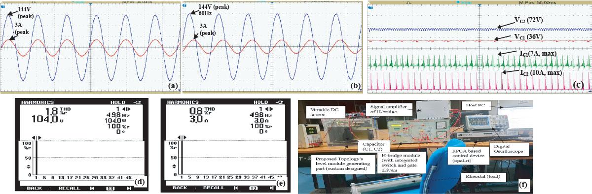 Experimental results (a) Output voltage and current for 48 Ω load. (b) Output voltage and current for 48∠ 45° Ω load. (c) Voltage and current profile of capacitor C1 and C2 for supplying load current of 3 A (d) THD of voltage. (e) THD of current (power quality analyser), (f) Hardware setup. THD, total harmonic distortion.