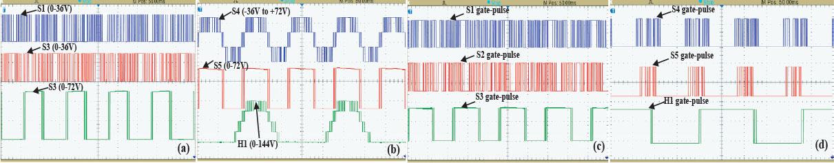 Voltage stress across different switches (a) stress across switches S1, S2, and S3 (b) stress across switches S1, S2, and S5 (c) gate pulse sequence of switches S1, S2, and S3 (d) gate pulse sequence of switches S4, S5 and H1.