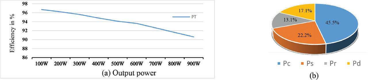 Output during transient state (a) Efficiency curves vs load (b) Loss proportion analysis for 500 W load.