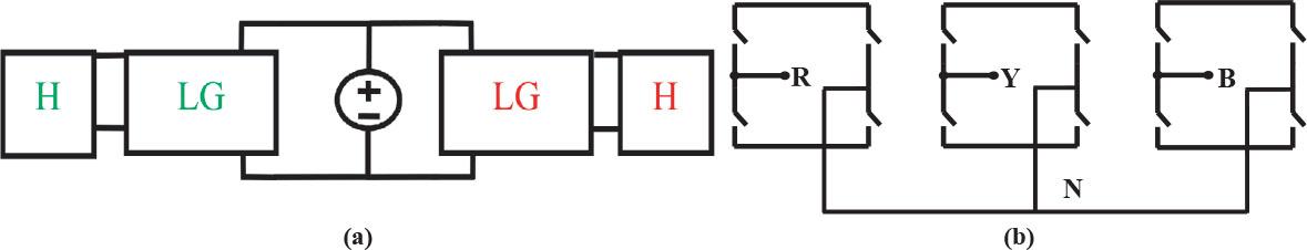 The proposed circuit extension to a three-phase system is possible as depicted in Figure 13(a). The R phase is in red colour, and the Y phase is in green colour. Considering the figure complexity, the entire circuit is not shown and just R-phase and Y-phase are shown. Similarly, the B-phase can be extended. Keeping the DC voltage source common, the level–generating circuit (LG) circuit and their respective H-bridge circuit can be connected as shown in Figure 13(a). The basic multilevel inverter proposed consists of an input DC followed by a level-generating circuit and then a H-bridge for polarity reversal. The proposed three-phase circuit works well with isolated loads in each phase. But any unified three-phase loading becomes little tricky and identification of a common neutral point is to be considered. Each phase has its own H-bridge as shown in Figure 13(b). A possible way of forming common neutral along with R, Y, B line terminal would be what shown in Figure 13(b). As the basic circuit and its extended variant (with single DC input source) contain only one DC input source and hence a balanced three-phase circuit can be constructed. Thus, the formation of a three-phase MLI is seamless without the use of any extra DC source. Use of only one DC source is also advantageous considering such a configuration will require only one charging circuit and maximum power point tracker (MPPT) control. The problem of array mismatching in case of multiple PV integrated DC source is eliminated. Thus, the single DC source in the middle serving as input source for all the three phase simultaneously is an advantage from many points of view.