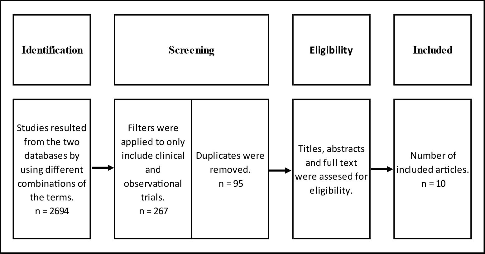 The initial search retrieved a number of 2694 studies from all the different combinations of the used terms. After filtering to only include clinical and observational trials, 267 studies remained. The next step was to take out the duplicates from the different searches that were conducted. This step yielded 95 studies. Further analysis was conducted on the title, abstract, and full text of the resulting articles, and in the end a number of 10 studies that best fit our criteria were included in the current review (Figure 1).