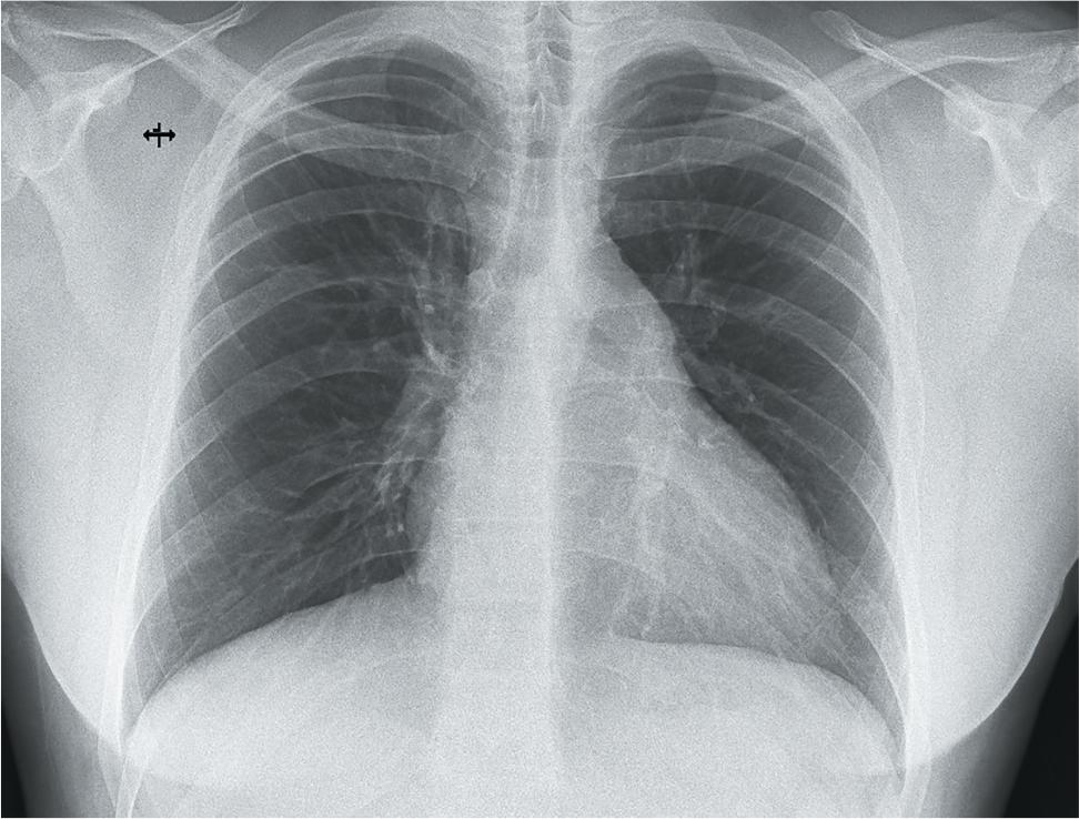 Upon initial evaluation at our clinic, the patient presented with moderate dyspnoea, NYHA II (New York Heart Association Functional Classification), especially with moderate exertion. A 6-min walking test was performed, and the patient managed to walk 450 m, with dyspnoea of 5/10 on the Borg scale, and SpO2 of 98% at the beginning and 93% at the end of the test. The chest X-ray revealed cardiomegaly, with clear lung fields (Figure 1).