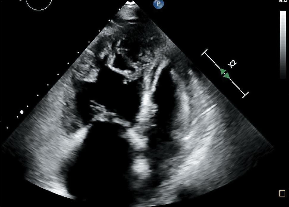 Blood tests showed polycythaemia and a mildly increased N-terminal pro B-type natriuretic peptide (NTproBNP) of 677 pg/mL. Pulmonary function tests showed normal respiratory volumes and flows, but with a moderately low diffusion lung capacity for carbon monoxide (DLCO) of 49% predicted. The electrocardiogram showed an aspect of right ventricular strain and an incomplete right bundle branch block. A cardiac ultrasound was performed that showed dilation of the right heart, with a RA (right atrium) of 74 mm and a RV (right ventricle) of 40 mm, a low TAPSE (Tricuspid Annular Plane Systolic Excursion) of 16 mm, global right ventricular systolic dysfunction, severe tricuspid regurgitation, a RA-RV gradient of 80 mmHg, with a high probability of PH, an estimated sPAP (Systolic Pulmonary Artery Pressure) of 85 mmHg. Left ventricular structure and function were normal, and no pericardial effusion was detected (Figure 2).