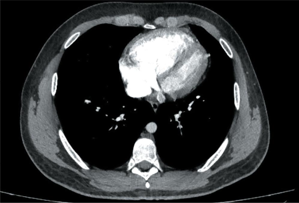 On contrast-enhanced chest CT (Computed Tomography), a major pulmonary artery dilation and dilated right heart were observed, without pulmonary embolism and changes in the pulmonary parenchyma. Neither transthoracic echocardiography nor CT examination revealed congenital heart diseases (Figures 3 and 4).