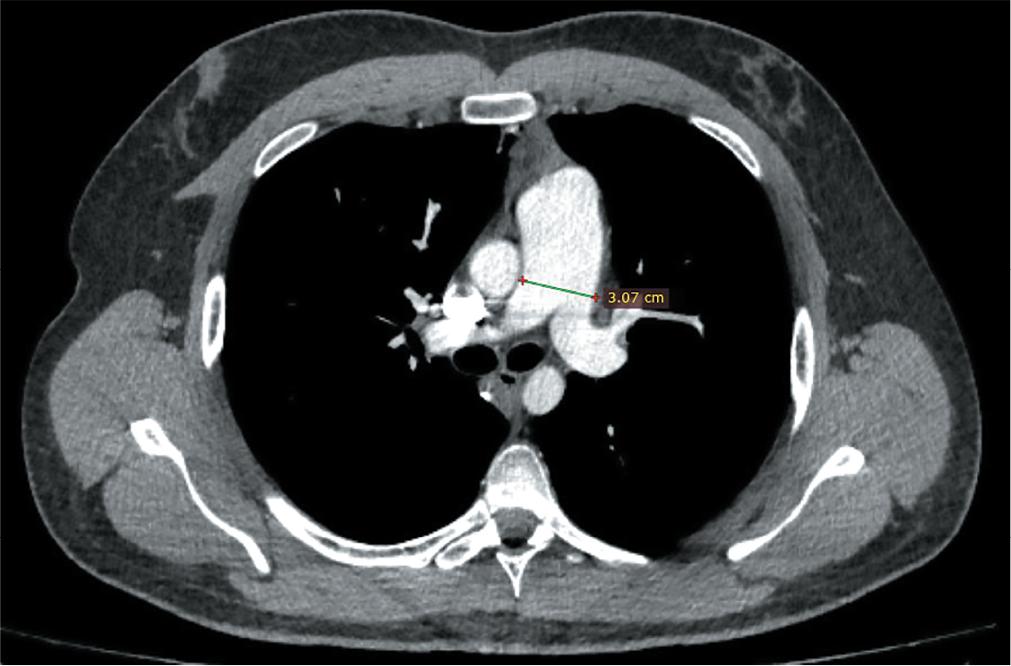 Contrast-enhanced chest CT scan transversal sections showing evidence of major dilation of the pulmonary arterial trunk.