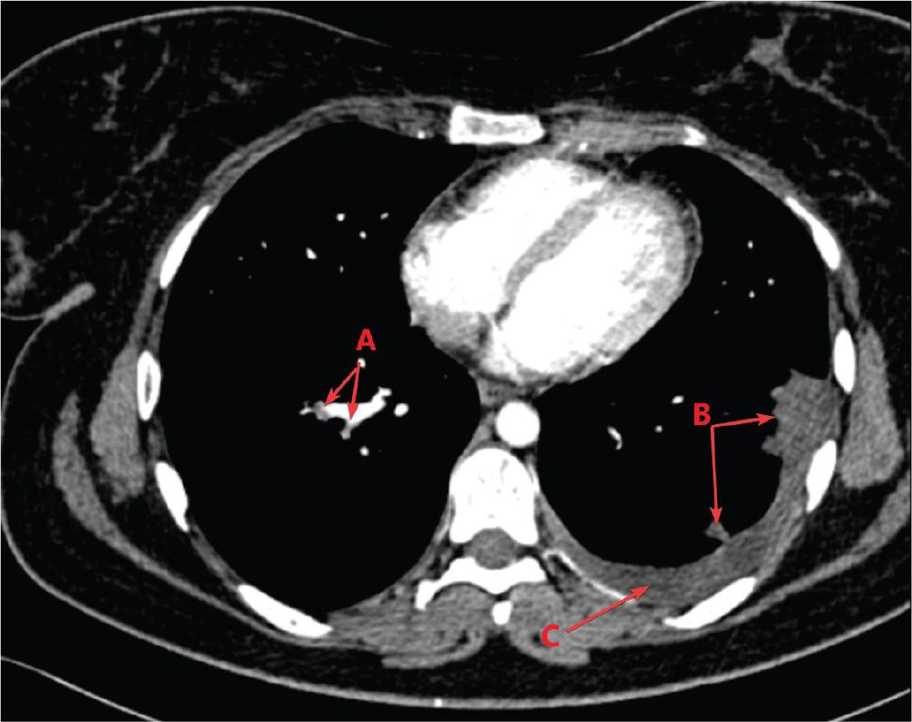 Contrast-enhanced chest CT scan: (A) PE, (B) pulmonary infarcts, (C) pleural effusion. CT, computed tomography; PE, pulmonary thromboembolism.
