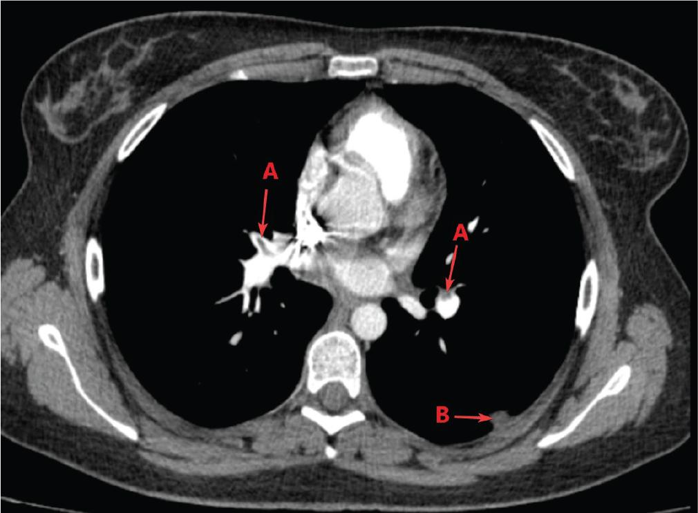 Contrast-enhanced chest CT scan: (A) PE, (B) pulmonary infarcts. CT, computed tomography; PE, pulmonary thromboembolism.