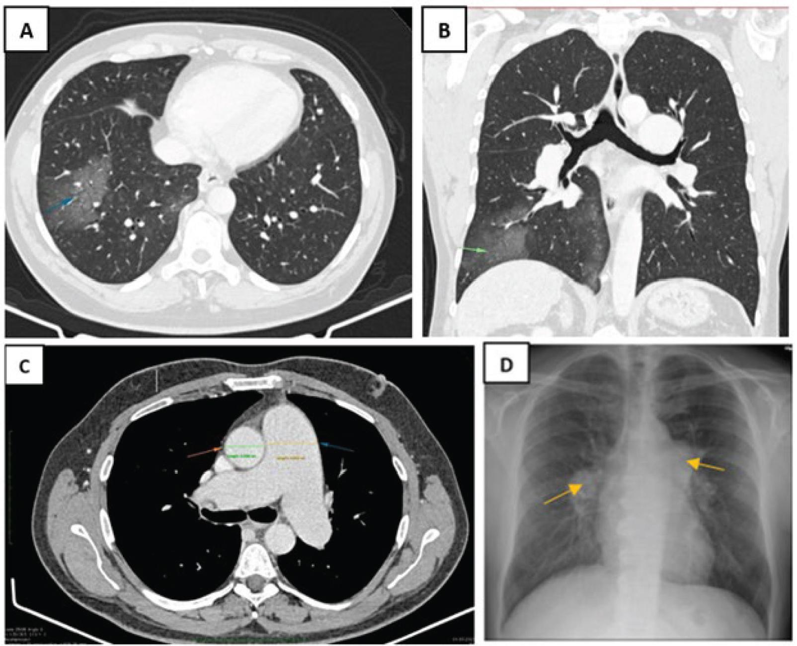 (A) Axial CT scan, lung window; (B) Coronal CT scan, lung window – ground-glass opacities (blue arrow A, green arrow B) with a confluent lobular pattern are visible in the right basal pyramid, involving both peribronchovascular and peripheral regions, secondary to recent episodes of haemoptysis. (C) Pulmonary arterial phase of thoracic CT revealed significant enlargement of the main pulmonary artery (blue arrow), which exceeded the diameter of the adjacent ascending aorta (red arrow) – a classic radiologic feature suggestive of PH. (D) Chest X-ray at first check-up showed hilar opacities with a polycyclic appearance. PH, pulmonary hypertension.