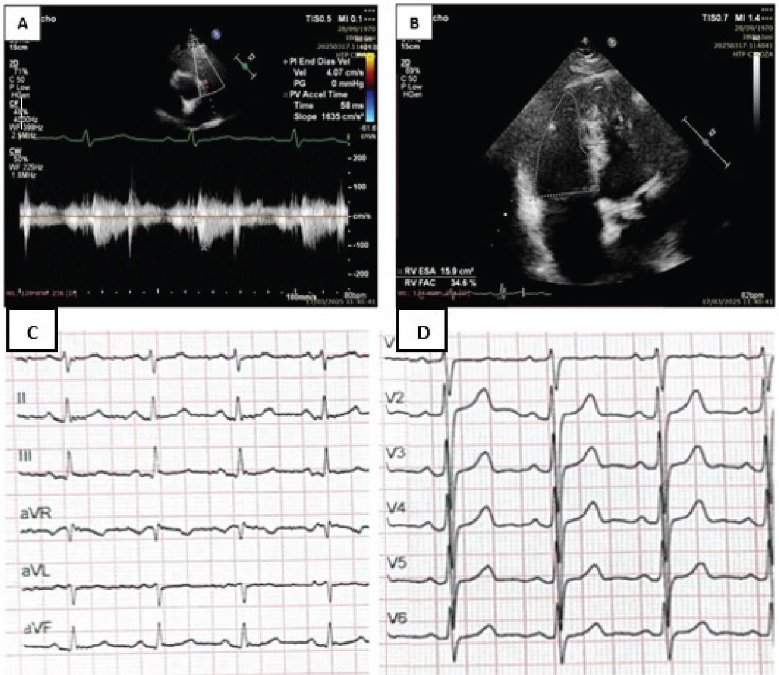 Transthoracic echocardiography (TTE) revealed a mildly dilated left ventricle (end-diastolic diameter 47 mm) without hypertrophy (interventricular septum 12 mm, posterior wall 11 mm) and a preserved systolic function, as reflected by a left ventricular ejection fraction of 65%. There were no findings suggestive of left heart disease. The right heart evaluation showed a right ventricular (RV) diameter of 39 mm and a right atrial (RA) volume of 52 mL. Estimated systolic pulmonary artery pressure (sPAP) was 58 mmHg, based on a right atrium–right ventricle (RA–RV) pressure gradient of 55 mmHg. Tricuspid annular plane systolic excursion (TAPSE) measured 21 mm, and pulmonary acceleration time (PAT) was 56 ms, consistent with elevated pulmonary pressure (Figures 2A and 2B). The TAPSE/sPAP ratio was calculated at 0.36 mm/mmHg, a value exceeding the 0.30 mm/mmHg prognostic threshold associated with better transplant-free survival in PoPH, as reported in recent studies (15). N-terminal pro-B-type natriuretic peptide (NT-proBNP) was 52.5 pg/mL, consistent with a low-risk PAH profile. These results, together with an Electrocardiography (ECG) showed sinus rhythm, rightward QRS axis (lead I predominantly negative, lead aVF predominantly positive, QRS axis >+90°), with R/S = 1 in V6, suggestive of right ventricular (RV) hypertrophy, and no ischaemic changes. Coronary angiography revealed no significant lesions. support a non-ischaemic and non-inflammatory aetiology for the patient’s elevated pulmonary pressures.