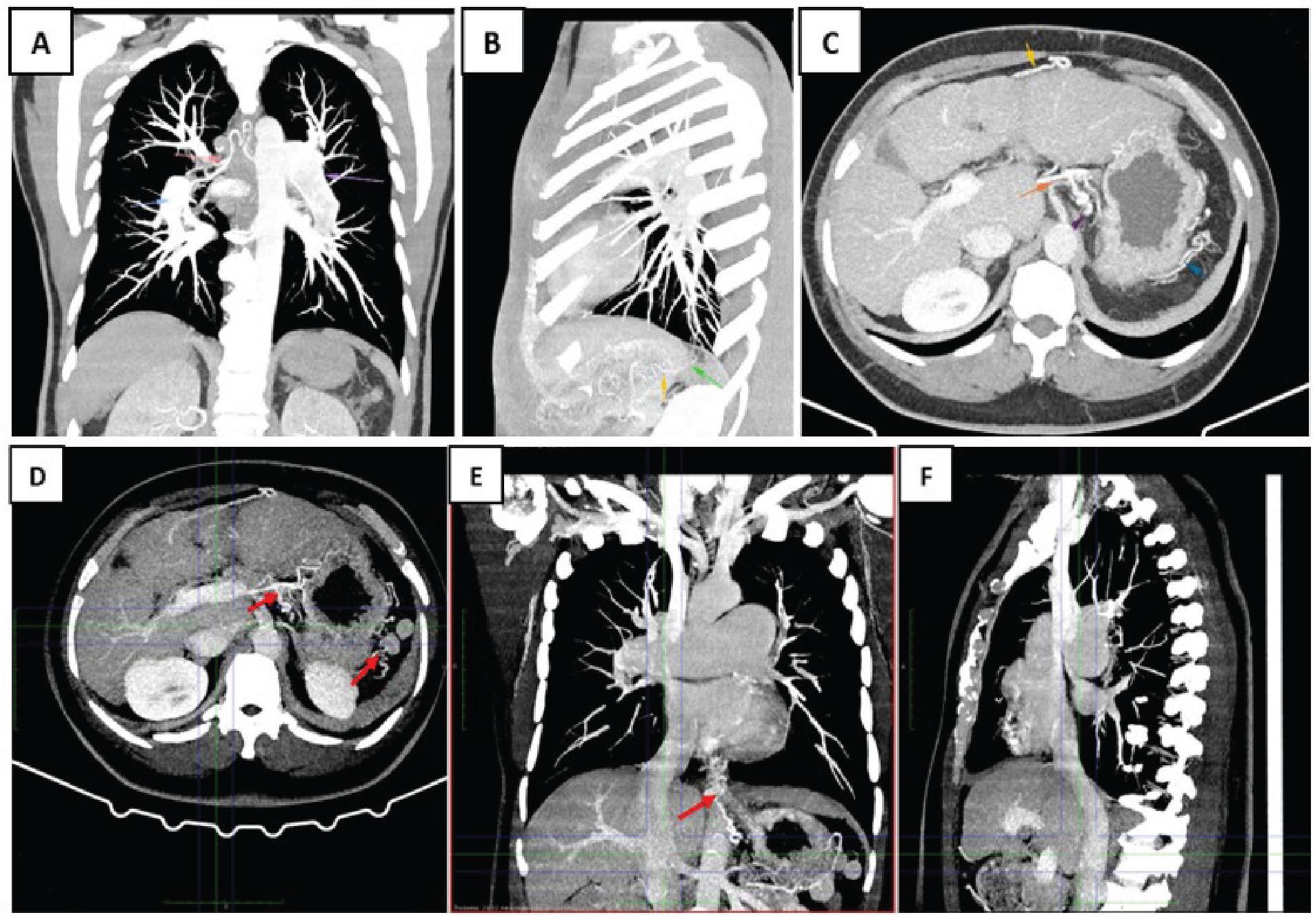 MIP reconstructions (coronal, sagittal, axial planes) showing multiple dilated portosystemic collateral vessels. (A) Coronal CT image showing dilatation of the pulmonary arteries (blue and purple arrows) and hypertrophy of the bronchial arteries (red arrow), as part of the compensatory mechanism associated with PoPH. (B) Sagittal reconstruction highlighting the trajectory of collateral venous circulation in portosystemic shunting pathways; (C) Axial abdominal CT reconstruction illustrating a cirrhotic liver with a nodular contour and irregular hepatic surface. Note the dilated portal vein (red arrow) and the partially visualised recanalised paraumbilical vein (yellow arrow), suggestive of PHT. (D–F) MIP reconstruction (axial, coronal, and sagittal) highlights the pulmonary arterial arborisation and extensive abdominal collateral vessels. Aberrant ascending venous pathways, likely originating from perioesophageal and diaphragmatic networks, suggest portopulmonary collateral formation potentially involved in localised pulmonary congestion or haemoptysis. MIP, maximum intensity projection; PHT, portal hypertension; PoPH, portopulmonary hypertension.