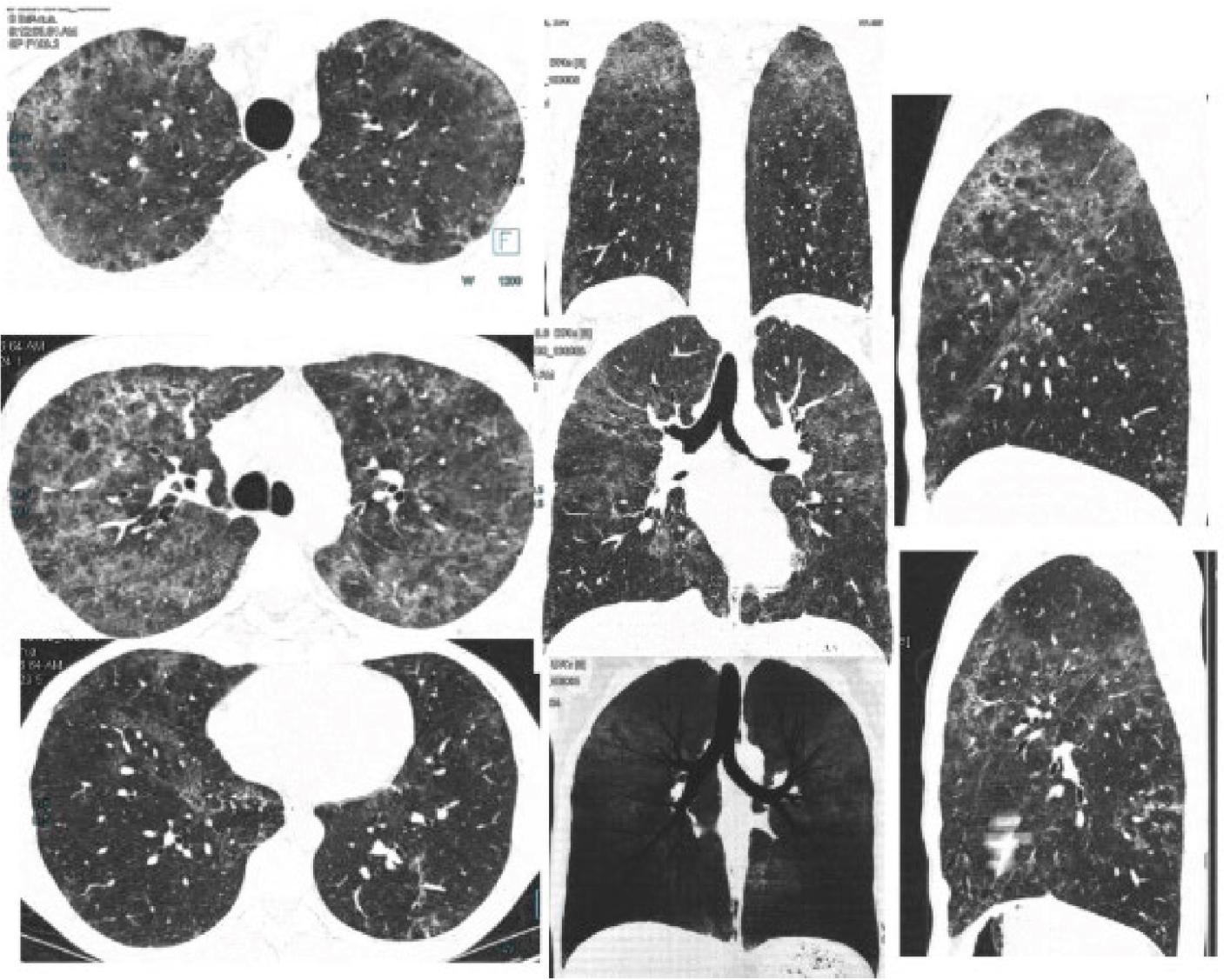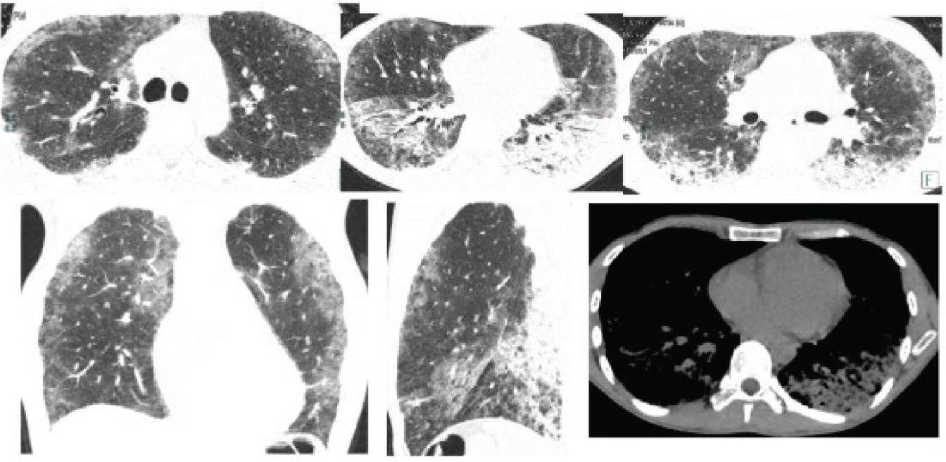 High-resolution CT images show patchy subpleural ground-glass opacities throughout both lungs and alveolar consolidations in both lower lobes. CT, computed tomography.