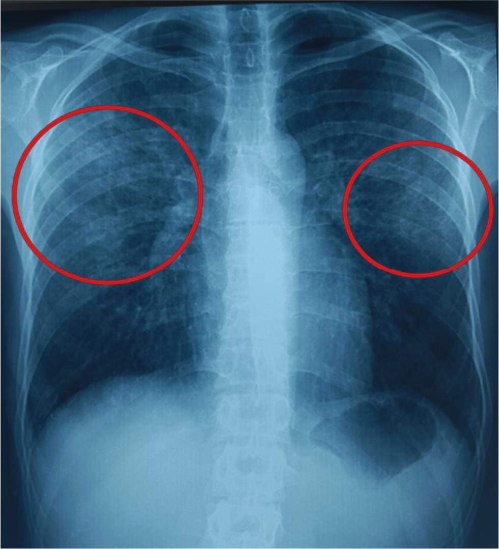 A 26-year-old male who works as a cook, with no known medical history but a history of passive smoking, presented in May 2024 to the emergency department with acute fever, cough, dyspnoea, diffuse headache, myalgia and arthralgia. He also reported fatigue. Examination showed a body mass index of 16.5 and stable vital signs (T: 38.6°C, HR: 118 bpm, BP: 100/70 mmHg, RR: 20/min, SpO2: 92%). Physical exam was otherwise unremarkable.