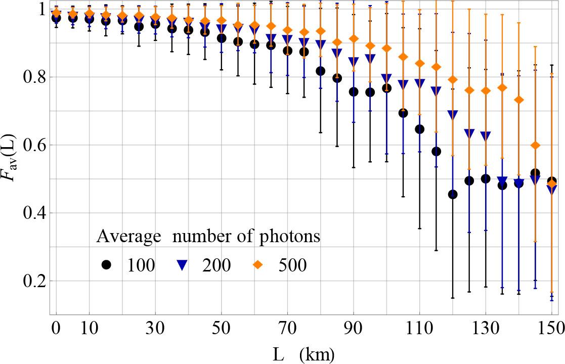 The efficiency of the framework should not be affected by the properties of input states ρin. Therefore, to find an indicator of the average performance, we first select a sample of input states, then apply the QST procedure to each ρin, and finally compute the average fidelity for the sample. Additionally, we calculate the sample standard deviation (SD) to quantify statistical dispersion. The sample SD is a natural choice for quantifying the uncertainty in QST affected by random noise since it effectively captures the variability in the performance of the framework. In our study, the fiber length is treated as an independent variable, implying that the average fidelity can be expressed as a function of L and denoted by Fav (L). Consequently, this figure of merit can be plotted to observe how the efficiency of QST changes as L increases.