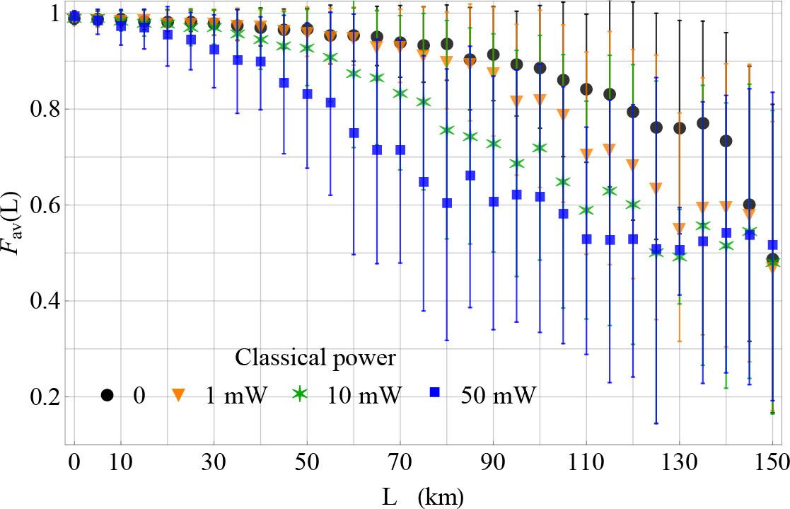 Figure 2 presents the efficiency of the QST framework, including the effects of Raman scattering but assuming zero crosstalk. The analysis involves four different levels of classical power Pin = 0, 1 mW, 10 mW, and 50 mW. As the classical power Pin increases, there is a clear trend of more rapid degradation in the average fidelity Fav(L). Specifically, with higher classical powers, the fidelity begins to drop off sooner as the fiber length increases.