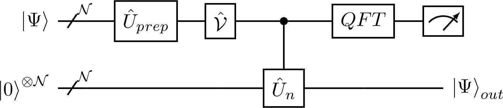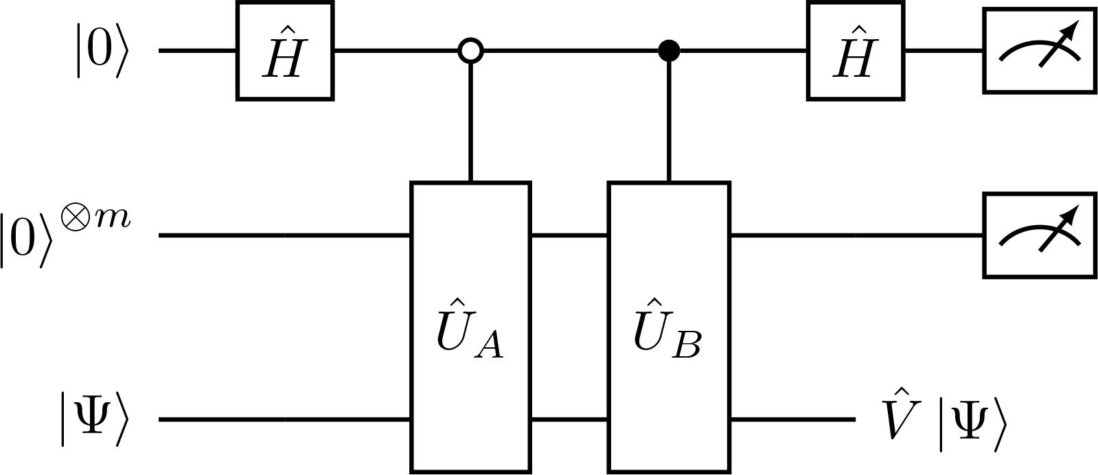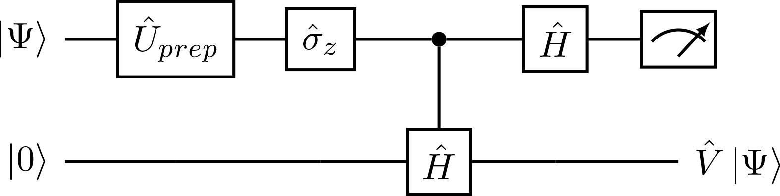 The last step in Eq. (54) incorporates a 0-bit measurement in the first register while omitting the normalization factor in the output state. In addition, Ĥ gate is the Hadamard gate and CĤ is the controlled Hadamard gate,