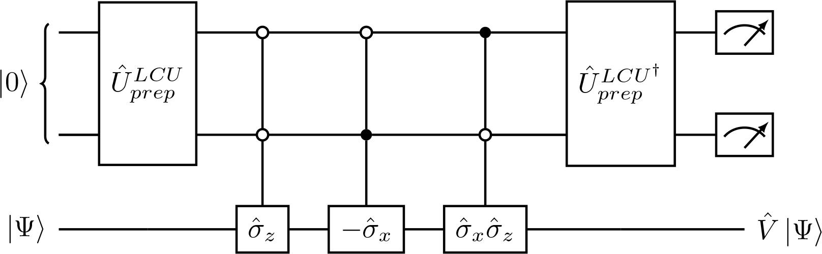 where m > 1 is the number of ancillary qubits required to perform LCU and that acts non-trivially only within a ℳ-qubits subspace, satisfying Eq. (44) for ℳ < < 𝒉 and ℳ ≤ m. Then, by defining the LCU and biorthogonal unitary implementations of and as and , respectively we can further perform an LCU on these black-box unitaries using only one additional ancillary qubit. Therefore, the total number of ancillary qubits required is m + 1 The corresponding LCU-select operator is given by,