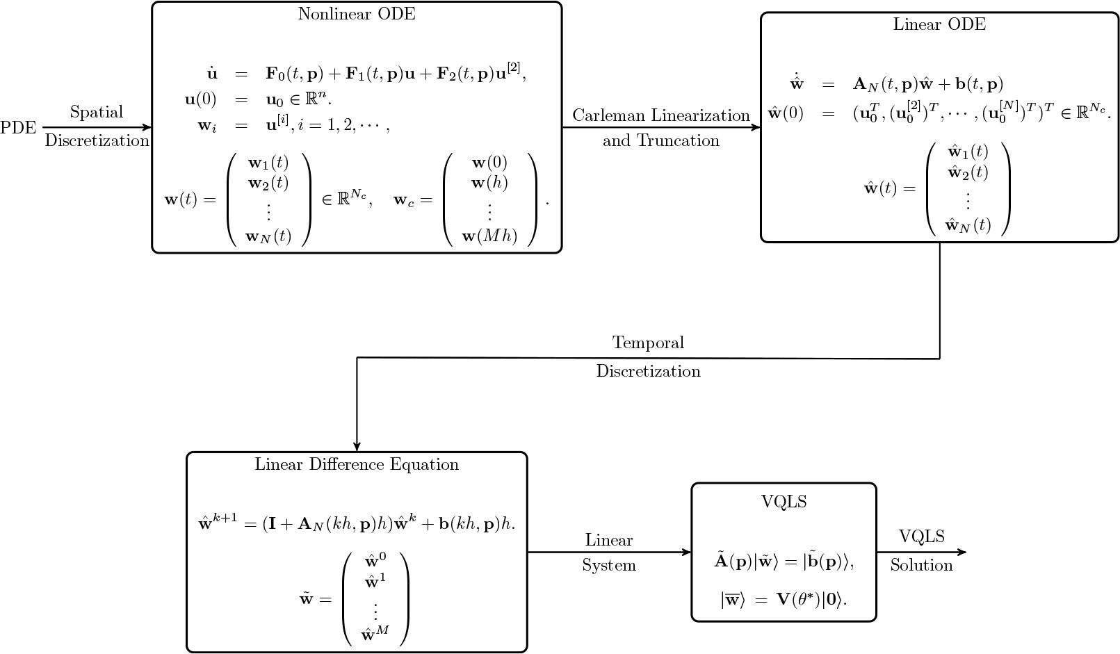 Below we describe the steps required to transform the solution of these nonlinear ODEs into a form amenable to VQLS, see Figure 1 for illustration of the steps involved.