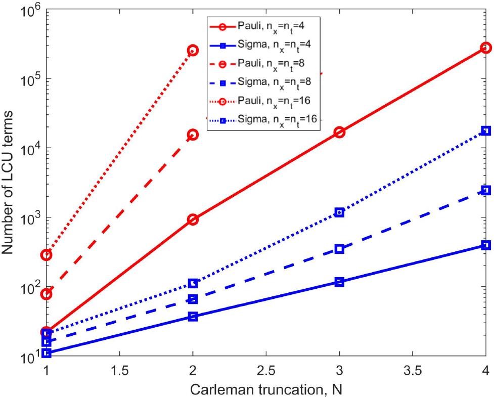 To demonstrate the efficacy of using the sigma basis compared to the Pauli basis, we compute the number of terms needed in the LCU decomposition for different matrix sizes for Ã1, Ã2. To vary the matrix size we consider different numbers of spatial/temporal discretization points nx and nt, respectively, and different values of CL truncation level N. For the Pauli basis we used the matrix slicing method proposed in [17] to determine the number of terms, while for sigma basis we used analytical expressions derived above. Figure 3 shows the comparison and highlights significantly better scaling for the sigma basis. For example, for nx = nt = 4, N = 4, LCU with Pauli basis generates 276, 000 terms whereas sigma basis gives rise to only 111 terms. Furthermore, computation of the Pauli LCU decomposition was too time consuming as the problem size increases as indicated by the missing data points for nx = nt = 8, 16 and N > 2.