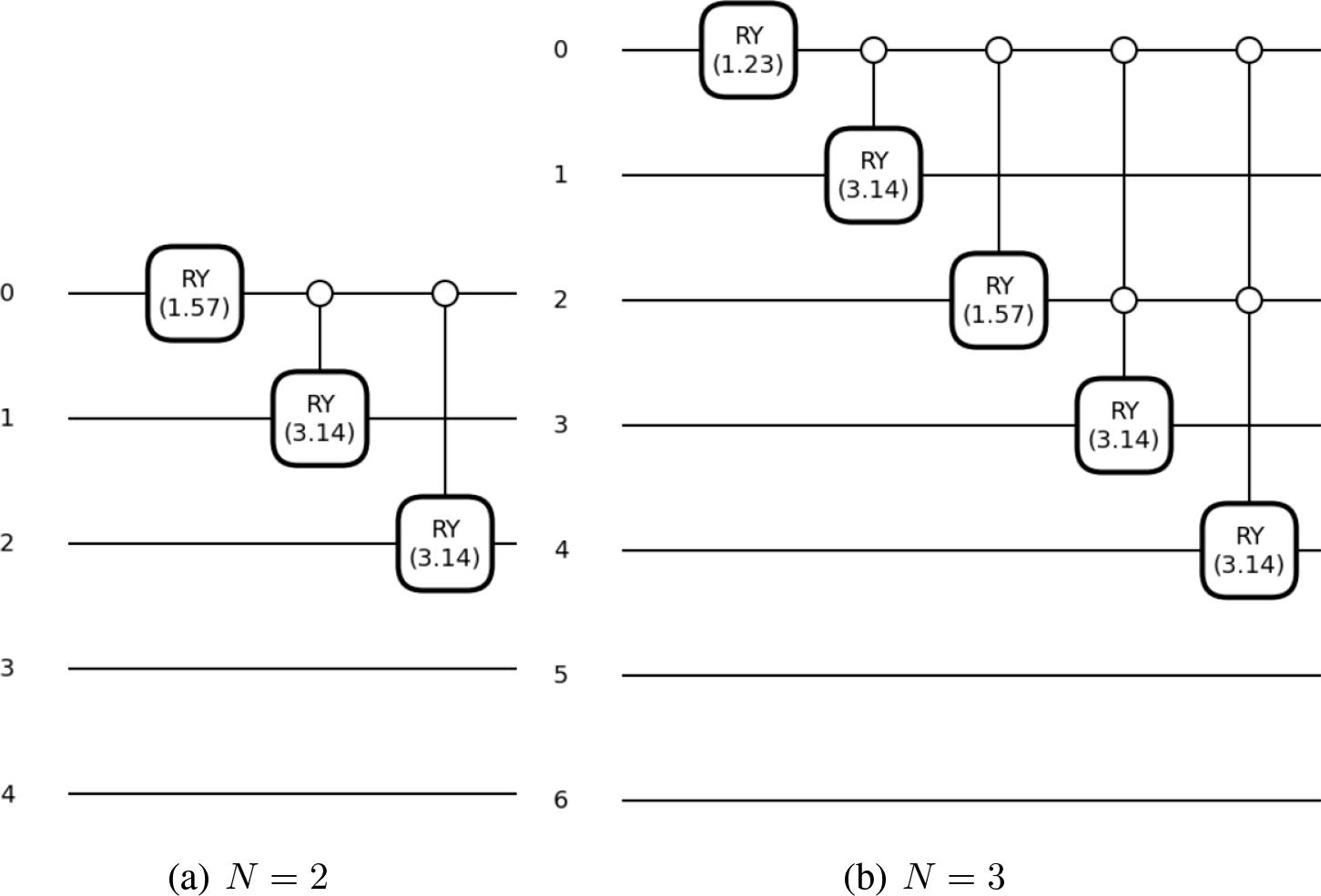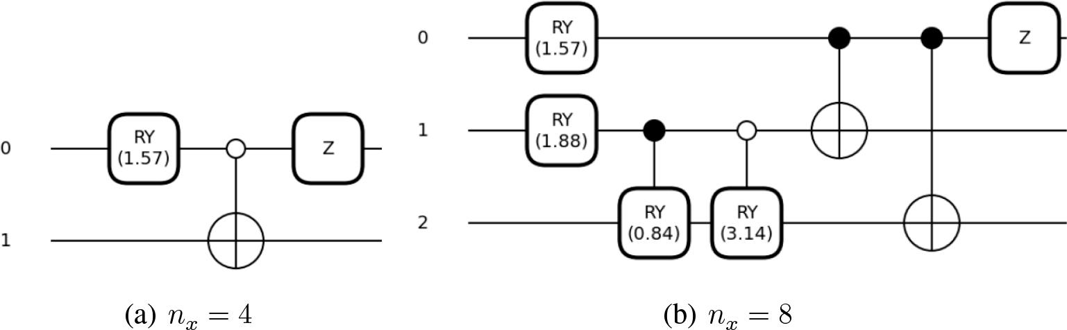 State preparation for u0 can be accomplished using RY, CNOT, and PauliZ gates as shown in Figure 4 for different values of nx. Next, starting from the state |0〉nx, we first create the state