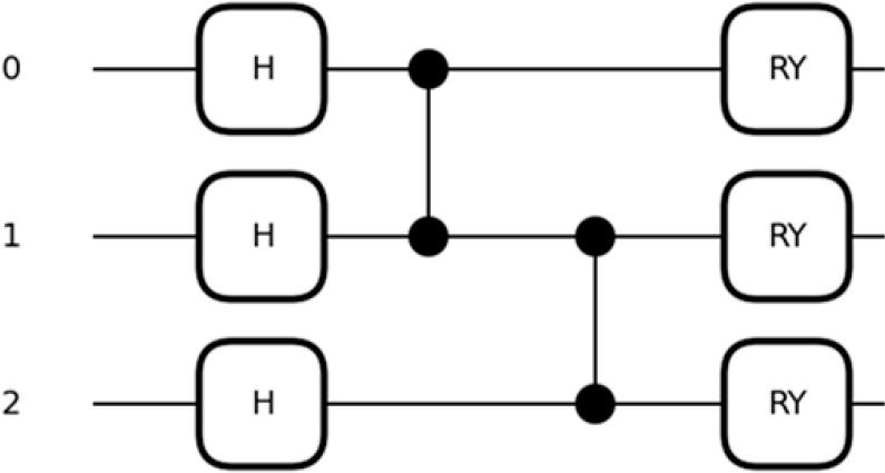 Ansatz: We use a modified version of the ansatz circuit 9 from [20] with 3 repetitions inspired by the work in [12]. This is shown in Figure 7.