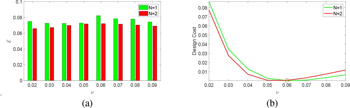 (a) CL+VQLS solution error ε (97) for the inverse Burgers problem for different values of ν and two CL truncation levels N = 1 and N = 2. (b) Design cost (Eq. (92)) as a function of ν obtained via our nBVQPCO framework for CL truncation levels N = 1 and N = 2. Also, marked are ν values where the cost takes the smallest value, which is ν = 0.06 for both the truncation levels. The true optima is known to be ν = 0.07.