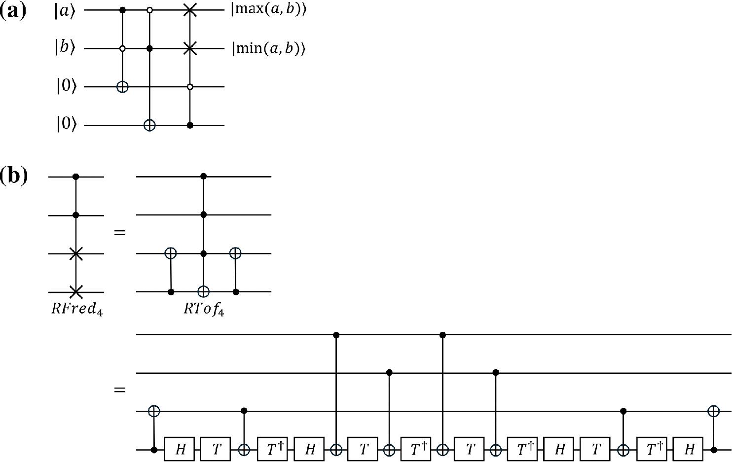 ![One-qubit sorting module. (a) Circuit diagram of the one-qubit sorting module employed in Ref. [33]. (b) Circuit of the four-qubit relative-phase Fredkin gate, constructed using the four-qubit relative-phase Toffoli gate proposed in Ref. [23], along with two CNOT gates. By replacing the Fredkin and Toffoli gates in Figure A1a with the four-qubit relative-phase Fredkin and relative-phase Toffoli gates from Ref. [23], the T-count of the one-qubit sorting module can be reduced from 29 to 16.](https://sciendo-parsed.s3.eu-central-1.amazonaws.com/68a877c8afc50a4de0964e8a/j_qic-2025-0016_fig_009.jpg?X-Amz-Algorithm=AWS4-HMAC-SHA256&X-Amz-Content-Sha256=UNSIGNED-PAYLOAD&X-Amz-Credential=ASIA6AP2G7AKNWGVUYYO%2F20260130%2Feu-central-1%2Fs3%2Faws4_request&X-Amz-Date=20260130T151000Z&X-Amz-Expires=3600&X-Amz-Security-Token=IQoJb3JpZ2luX2VjENb%2F%2F%2F%2F%2F%2F%2F%2F%2F%2FwEaDGV1LWNlbnRyYWwtMSJHMEUCIQD0X1DLpmJnqlMJ7snG0Ko12uddMzdO3h0bNKsKIwqYtgIgYuwvQMUKbod1JXbgFxnZOb4PC4HNdaljZ36HeeRQYVwqxAUIn%2F%2F%2F%2F%2F%2F%2F%2F%2F%2F%2FARACGgw5NjMxMzQyODk5NDAiDDK6ASK3hGOFLE8D8yqYBfYUczh%2FTIdg%2FKcQw08wu3zRet0MFH0be%2FfIsn0N0Ps5ynwZO%2Bcw%2FWYCLic6qOJE2kZ%2BVJWUHbQNqEbhF8CpPK43ERtjzuqVALclCKgbKWF1hbV3w%2BLdc%2Bqbwu%2BLTnTkcedc10Y9m%2FU6fjKM1WXCJxZABhcTdX4rhmql5A7usRKZNOXGp3DUEpnp3TNEaYzhc%2FZZYUvn1HNhjtB8bKFHTfs4ETURLtU2AIza4T3lNXcOY6NAL%2F8VkzwfgADA6GiQaBV0RomsfYy3VPhFpG8YdpRHJAPZMHs%2F0xkOMTGb%2BvOHIEm%2Bz8CBKb6l93PZ2MFg%2BqANAa%2BkL1vj%2BsRhvlP0%2FAGhpiWiNBp9W31Zev6L%2FZZRifBvq2sun7vNVyQMbR%2FrnMhXF70tPWyd35LcluGenHkXSCzv%2FHpGZl9VNSDFySwF%2B6Z%2BAl%2B2snJeyTHyPJIOO0QnoPKmc4qLJ2O2PLXP9N7irSBuIxRHSPEgrknxkkW4tuQXhZiH5YzDfoArF8Nfqno%2B3w3fVyrwspLJpVERBeXkEcyHfeWQW3l9fBqEr0tePHEWWzll4lGsK5FtBXbzECPJ5NJyW7bTQB63MWZNCvRlbJDGsGwz5nzNp3YPotz38icKBZSDQiYqtYH%2BjzvFeZPZGfP3I9Q%2F6nnViNrroa6KAIcU9h91gwDr%2BU85bMts3xHvyMeMdaVWo9VTyewj6%2B6ZSyIiIGiDugMLxYasFoEW0AewD9CE2p1XuERahe1qwSJk6pDEgbpRkP40rRaLdg8yY%2BG76t%2FZud5Wniml0pJhWvl%2Fi2VQrKoqkHXItXX8ZvohzFWnlMIVKnSemiwMkR2ArJL0bNDy6pW6iFDAxGVYKGtasByA9%2BZaD6OttymeTy%2BgUQs9mocw7u7yywY6sQHwwIURvITATCs3g9jbo4ov7P2Ulp3pe%2BjVINWvQbH1NtmUMsdLdS7lhXUoYqDdjKqHg7zOPBMVz3%2BVzvhKd04dsQOhgaRa4UIK79cUbCc1lVp0L%2F56eBVrPmRBoQ8M7FJsXCYH8XiGxOQuOG6I%2FlJzWu%2BwWc5odlhvTJ0a%2FPlLnwPYlhC1KzvtHEc84QfB%2F7wzhCXrxt5eiUUxlQe2WnJ4eSG6yMUFBdXw2K6QYX13ML0%3D&X-Amz-Signature=077b30f635151bbd8a68381bb76dd152e71e2d2988ffd50d55e5d93993004760&X-Amz-SignedHeaders=host&x-amz-checksum-mode=ENABLED&x-id=GetObject)