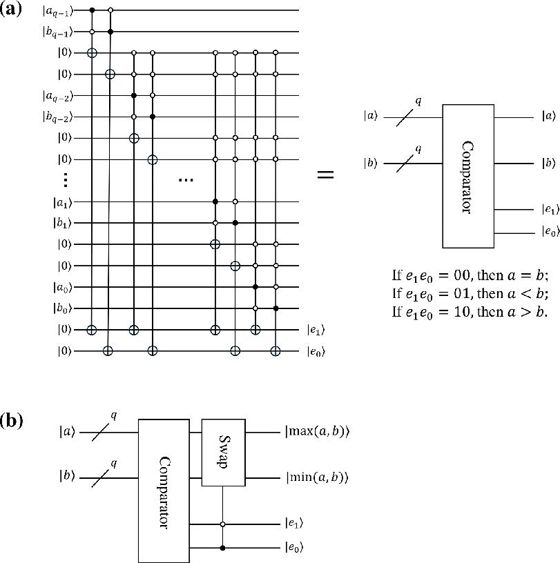 ![q-qubit sorting module. (a) Circuit diagram of the q-qubit comparator presented in Ref. [36], which compares the quantum states |a〉 = |aq–1 aq–2 … a0〉 and |b〉 = |bq – 1bq–2 … b0〉. (b) Circuit diagram of the q-qubit sorting module utilized in Ref. [33].](https://sciendo-parsed.s3.eu-central-1.amazonaws.com/68a877c8afc50a4de0964e8a/j_qic-2025-0016_fig_010.jpg?X-Amz-Algorithm=AWS4-HMAC-SHA256&X-Amz-Content-Sha256=UNSIGNED-PAYLOAD&X-Amz-Credential=ASIA6AP2G7AKNWGVUYYO%2F20260130%2Feu-central-1%2Fs3%2Faws4_request&X-Amz-Date=20260130T151000Z&X-Amz-Expires=3600&X-Amz-Security-Token=IQoJb3JpZ2luX2VjENb%2F%2F%2F%2F%2F%2F%2F%2F%2F%2FwEaDGV1LWNlbnRyYWwtMSJHMEUCIQD0X1DLpmJnqlMJ7snG0Ko12uddMzdO3h0bNKsKIwqYtgIgYuwvQMUKbod1JXbgFxnZOb4PC4HNdaljZ36HeeRQYVwqxAUIn%2F%2F%2F%2F%2F%2F%2F%2F%2F%2F%2FARACGgw5NjMxMzQyODk5NDAiDDK6ASK3hGOFLE8D8yqYBfYUczh%2FTIdg%2FKcQw08wu3zRet0MFH0be%2FfIsn0N0Ps5ynwZO%2Bcw%2FWYCLic6qOJE2kZ%2BVJWUHbQNqEbhF8CpPK43ERtjzuqVALclCKgbKWF1hbV3w%2BLdc%2Bqbwu%2BLTnTkcedc10Y9m%2FU6fjKM1WXCJxZABhcTdX4rhmql5A7usRKZNOXGp3DUEpnp3TNEaYzhc%2FZZYUvn1HNhjtB8bKFHTfs4ETURLtU2AIza4T3lNXcOY6NAL%2F8VkzwfgADA6GiQaBV0RomsfYy3VPhFpG8YdpRHJAPZMHs%2F0xkOMTGb%2BvOHIEm%2Bz8CBKb6l93PZ2MFg%2BqANAa%2BkL1vj%2BsRhvlP0%2FAGhpiWiNBp9W31Zev6L%2FZZRifBvq2sun7vNVyQMbR%2FrnMhXF70tPWyd35LcluGenHkXSCzv%2FHpGZl9VNSDFySwF%2B6Z%2BAl%2B2snJeyTHyPJIOO0QnoPKmc4qLJ2O2PLXP9N7irSBuIxRHSPEgrknxkkW4tuQXhZiH5YzDfoArF8Nfqno%2B3w3fVyrwspLJpVERBeXkEcyHfeWQW3l9fBqEr0tePHEWWzll4lGsK5FtBXbzECPJ5NJyW7bTQB63MWZNCvRlbJDGsGwz5nzNp3YPotz38icKBZSDQiYqtYH%2BjzvFeZPZGfP3I9Q%2F6nnViNrroa6KAIcU9h91gwDr%2BU85bMts3xHvyMeMdaVWo9VTyewj6%2B6ZSyIiIGiDugMLxYasFoEW0AewD9CE2p1XuERahe1qwSJk6pDEgbpRkP40rRaLdg8yY%2BG76t%2FZud5Wniml0pJhWvl%2Fi2VQrKoqkHXItXX8ZvohzFWnlMIVKnSemiwMkR2ArJL0bNDy6pW6iFDAxGVYKGtasByA9%2BZaD6OttymeTy%2BgUQs9mocw7u7yywY6sQHwwIURvITATCs3g9jbo4ov7P2Ulp3pe%2BjVINWvQbH1NtmUMsdLdS7lhXUoYqDdjKqHg7zOPBMVz3%2BVzvhKd04dsQOhgaRa4UIK79cUbCc1lVp0L%2F56eBVrPmRBoQ8M7FJsXCYH8XiGxOQuOG6I%2FlJzWu%2BwWc5odlhvTJ0a%2FPlLnwPYlhC1KzvtHEc84QfB%2F7wzhCXrxt5eiUUxlQe2WnJ4eSG6yMUFBdXw2K6QYX13ML0%3D&X-Amz-Signature=956350ca241e1a98556927885b78f5059e2189461072a00f08d6feba1e9d6370&X-Amz-SignedHeaders=host&x-amz-checksum-mode=ENABLED&x-id=GetObject)