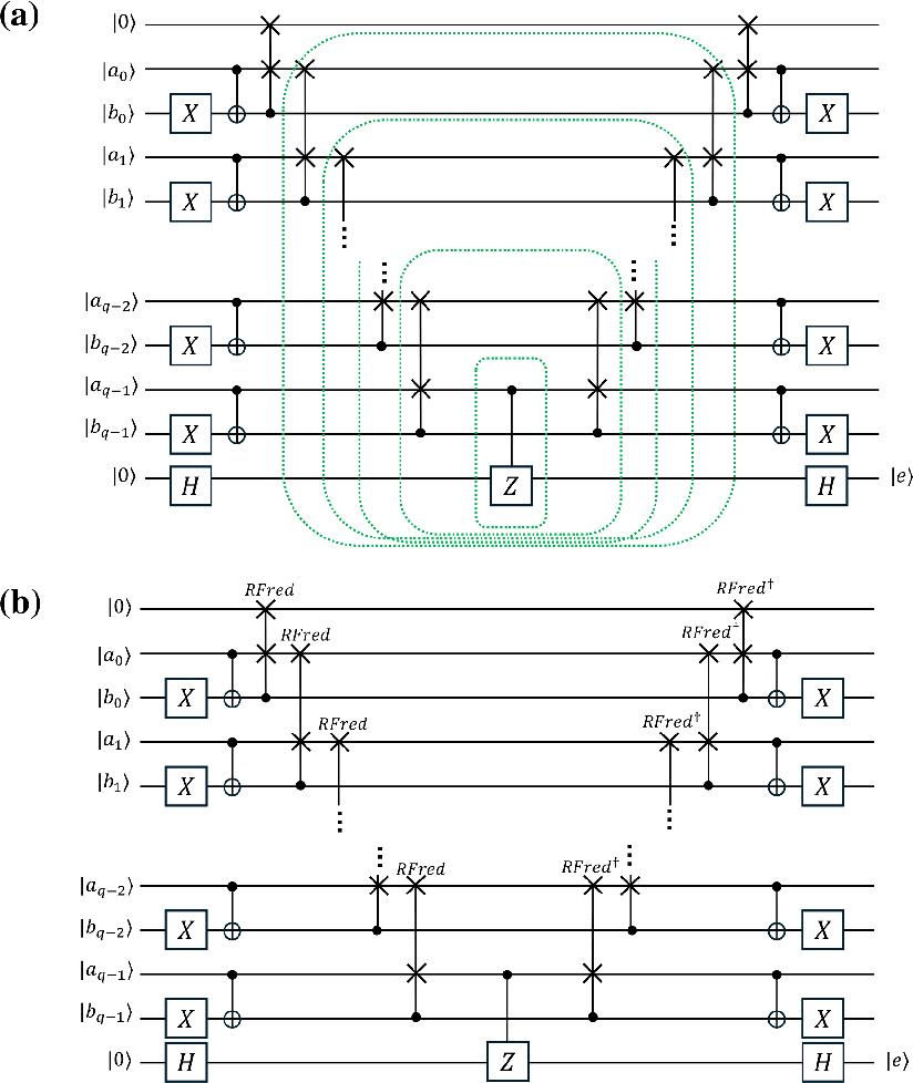 ![Optimization of the q-qubit comparator circuit presented in Ref. [37]. (a) Decomposition of the CNOT gate highlighted in the red box of Figure A4 into a controlled-Z gate and two Hadamard gates, which ensures that each subcircuit enclosed by the green boxes admits a diagonal matrix representation. (b) Optimized circuit obtained by replacing each pair of Fredkin gates in Figure A4 with the relative-phase Fredkin gate shown in Figure 1b and its Hermitian conjugate, thereby reducing the total T-count from 14q to 8q.](https://sciendo-parsed.s3.eu-central-1.amazonaws.com/68a877c8afc50a4de0964e8a/j_qic-2025-0016_fig_013.jpg?X-Amz-Algorithm=AWS4-HMAC-SHA256&X-Amz-Content-Sha256=UNSIGNED-PAYLOAD&X-Amz-Credential=ASIA6AP2G7AKNWGVUYYO%2F20260130%2Feu-central-1%2Fs3%2Faws4_request&X-Amz-Date=20260130T151000Z&X-Amz-Expires=3600&X-Amz-Security-Token=IQoJb3JpZ2luX2VjENb%2F%2F%2F%2F%2F%2F%2F%2F%2F%2FwEaDGV1LWNlbnRyYWwtMSJHMEUCIQD0X1DLpmJnqlMJ7snG0Ko12uddMzdO3h0bNKsKIwqYtgIgYuwvQMUKbod1JXbgFxnZOb4PC4HNdaljZ36HeeRQYVwqxAUIn%2F%2F%2F%2F%2F%2F%2F%2F%2F%2F%2FARACGgw5NjMxMzQyODk5NDAiDDK6ASK3hGOFLE8D8yqYBfYUczh%2FTIdg%2FKcQw08wu3zRet0MFH0be%2FfIsn0N0Ps5ynwZO%2Bcw%2FWYCLic6qOJE2kZ%2BVJWUHbQNqEbhF8CpPK43ERtjzuqVALclCKgbKWF1hbV3w%2BLdc%2Bqbwu%2BLTnTkcedc10Y9m%2FU6fjKM1WXCJxZABhcTdX4rhmql5A7usRKZNOXGp3DUEpnp3TNEaYzhc%2FZZYUvn1HNhjtB8bKFHTfs4ETURLtU2AIza4T3lNXcOY6NAL%2F8VkzwfgADA6GiQaBV0RomsfYy3VPhFpG8YdpRHJAPZMHs%2F0xkOMTGb%2BvOHIEm%2Bz8CBKb6l93PZ2MFg%2BqANAa%2BkL1vj%2BsRhvlP0%2FAGhpiWiNBp9W31Zev6L%2FZZRifBvq2sun7vNVyQMbR%2FrnMhXF70tPWyd35LcluGenHkXSCzv%2FHpGZl9VNSDFySwF%2B6Z%2BAl%2B2snJeyTHyPJIOO0QnoPKmc4qLJ2O2PLXP9N7irSBuIxRHSPEgrknxkkW4tuQXhZiH5YzDfoArF8Nfqno%2B3w3fVyrwspLJpVERBeXkEcyHfeWQW3l9fBqEr0tePHEWWzll4lGsK5FtBXbzECPJ5NJyW7bTQB63MWZNCvRlbJDGsGwz5nzNp3YPotz38icKBZSDQiYqtYH%2BjzvFeZPZGfP3I9Q%2F6nnViNrroa6KAIcU9h91gwDr%2BU85bMts3xHvyMeMdaVWo9VTyewj6%2B6ZSyIiIGiDugMLxYasFoEW0AewD9CE2p1XuERahe1qwSJk6pDEgbpRkP40rRaLdg8yY%2BG76t%2FZud5Wniml0pJhWvl%2Fi2VQrKoqkHXItXX8ZvohzFWnlMIVKnSemiwMkR2ArJL0bNDy6pW6iFDAxGVYKGtasByA9%2BZaD6OttymeTy%2BgUQs9mocw7u7yywY6sQHwwIURvITATCs3g9jbo4ov7P2Ulp3pe%2BjVINWvQbH1NtmUMsdLdS7lhXUoYqDdjKqHg7zOPBMVz3%2BVzvhKd04dsQOhgaRa4UIK79cUbCc1lVp0L%2F56eBVrPmRBoQ8M7FJsXCYH8XiGxOQuOG6I%2FlJzWu%2BwWc5odlhvTJ0a%2FPlLnwPYlhC1KzvtHEc84QfB%2F7wzhCXrxt5eiUUxlQe2WnJ4eSG6yMUFBdXw2K6QYX13ML0%3D&X-Amz-Signature=d17fe4853ce6e8cf3cfedaeda1704903d64e8bda54e7b26faf0214fa5492f08b&X-Amz-SignedHeaders=host&x-amz-checksum-mode=ENABLED&x-id=GetObject)