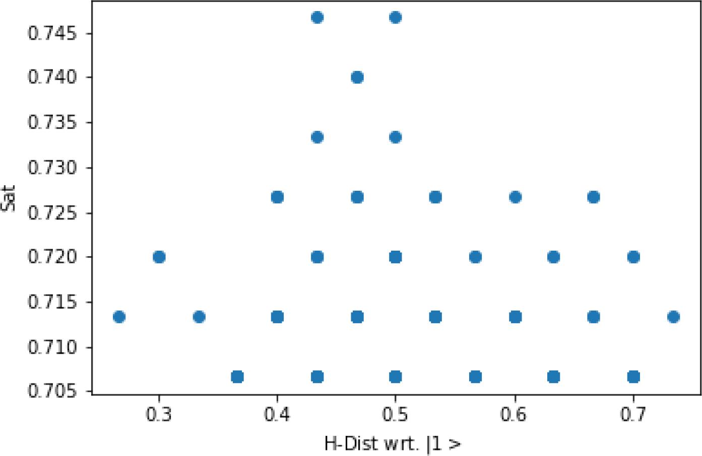 Plot of a typical cluster of solutions. Y-axis indicates fraction of clauses satisfied and X-axis represents the Hamming distance from the state |1〉⊗n (e.g.the state |–1〉⊗n/2 ⊗ |1⊗n/2 hasavalue 0.5 on the X-axis.