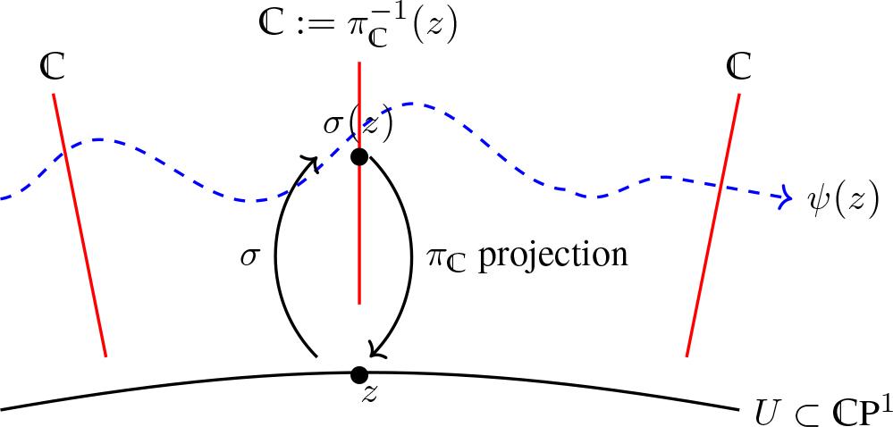15{\Gamma _{{\rm{hol}}}}(U \times ) \simeq \left\{ {\psi :U \subset {{\rm{P}}^1} \to \mid \psi (z) = {\cal U}\left( {{\lambda ^{ - 1}}} \right)\psi (z)} \right\},