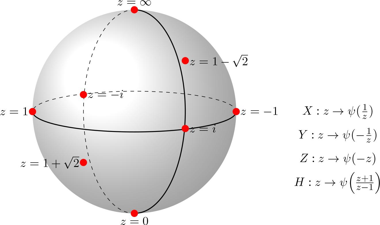 that is z \to {{z + 1} \over {z - 1}}. Then setting \theta = {\pi \over 4}, ϕ = {0, π} gives fixed points \{ 1 \pm \sqrt 2 \} . In the standard understanding, these transformations act on the basis states |0〉 and |1〉, but here it is represented by the stereographic coordinates z: |0〉 corresponds to z = ∞ and |1〉 corresponds to z = 0. Explicitly, for (34) if z = ∞, we obtain