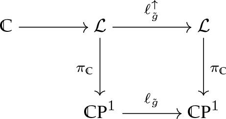 will be the representation space for \widetilde {\cal G}. Since we have the Möbius action in (11), this action has a nontrivial lift \ell _{\tilde g}^ \uparrow to the ℒ, as shown in the following commutative diagram such that {\ell _{\tilde g}}\;\cdot\;{\pi _} = {\pi _}\;\cdot\;\ell _{\tilde g}^ \uparrow . Here, the lift \ell _{\tilde g}^ \uparrow -action give rise to an action of the U (1) structure group of ℒ on the fibers v in terms of complex variables,