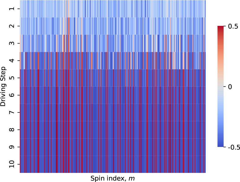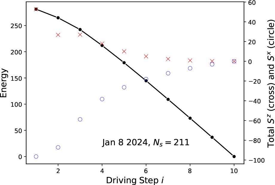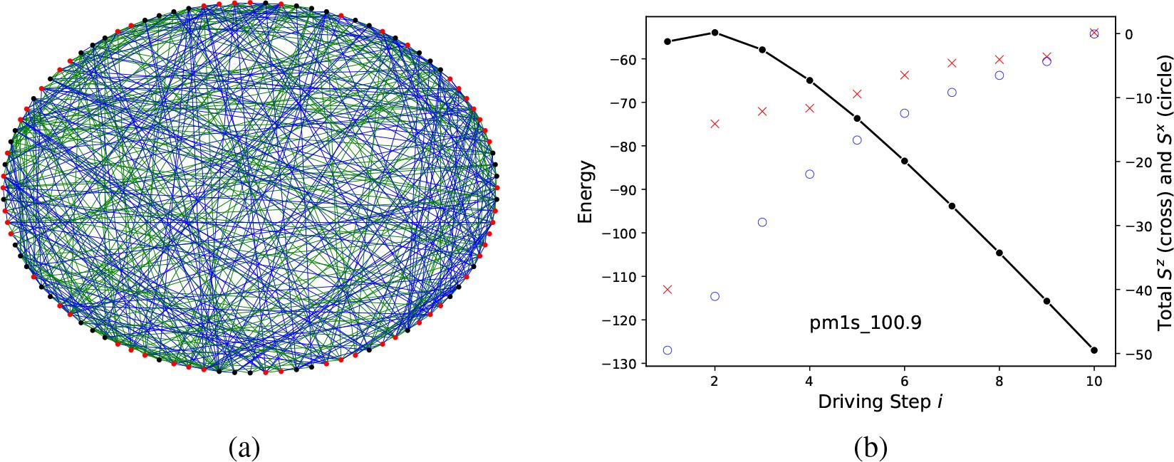 Twenty unweighted MaxCut instances from the Biq Mac Library with dense edges_ The first ten cases have NV = 60 and NE = 885, while the remaining cases have NV = 100 and NE = 2,475_ All edge weights are set to 1_ The algorithm successfully solves all instances except g05_100_3 and g05_100_5, where the E0 values should be – 1,424 and – 1,436, respectively [39,40]_ Here, Nsw refers to the number of DMRG sweeps per driving step, with hx = 1 and η = 0_3_